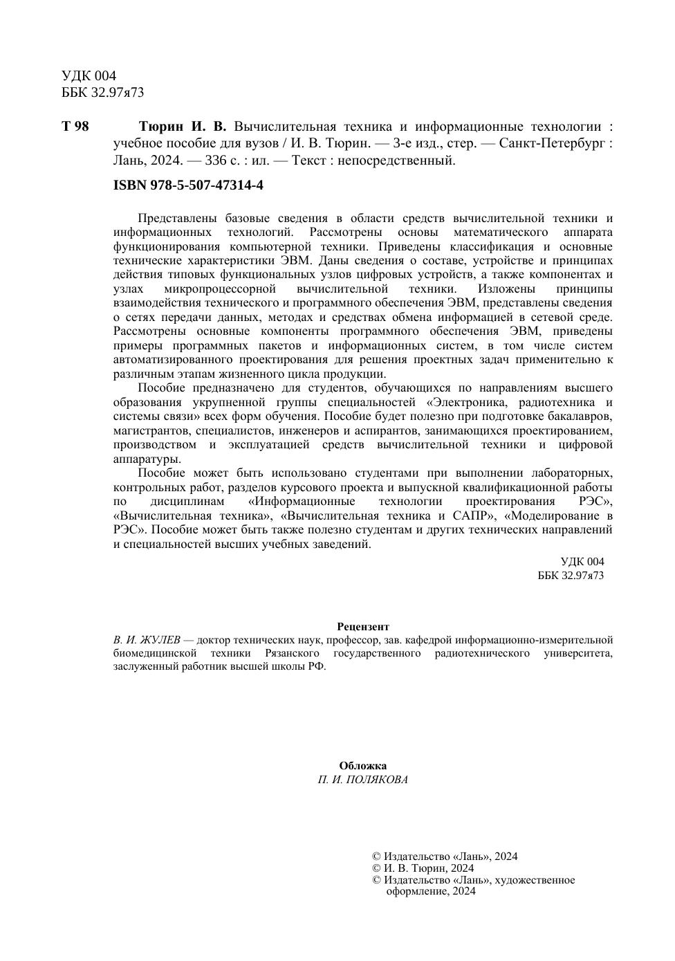 Представлены базовые сведения в области средств вычислительной техники и информационных технологий. Рассмотрены основы математического аппарата функционирования компьютерной техники. Приведены классификация и основные технические характеристики ЭВМ. Даны сведения о составе, устройстве и принципах действия типовых функциональных узлов цифровых устройств, а также компонентах и узлах микропроцессорной вычислительной техники. Изложены принципы взаимодействия технического и программного обеспечения ЭВМ, представлены сведения о сетях передачи данных, методах и средствах обмена информацией в сетевой среде. Рассмотрены основные компоненты программного обеспечения ЭВМ, приведены примеры программных пакетов и информационных систем, в том числе систем автоматизированного проектирования для решения проектных задач применительно к различным этапам жизненного цикла продукции. Пособие предназначено для студентов, обучающихся по направлениям высшего образования укрупненной группы специальностей «Электроника, радиотехника и системы связи» всех форм обучения. Пособие будет полезно при подготовке бакалавров, магистрантов, специалистов, инженеров и аспирантов, занимающихся проектированием, производством и эксплуатацией средств вычислительной техники и цифровой аппаратуры. Пособие может быть использовано студентами при выполнении лабораторных, контрольных работ, разделов курсового проекта и выпускной квалификационной работы по дисциплинам «Информационные технологии проектирования РЭС», «Вычислительная техника», «Вычислительная техника и САПР», «Моделирование в РЭС». Пособие может быть также полезно студентам и других технических направлений и специальностей высших учебных заведений.