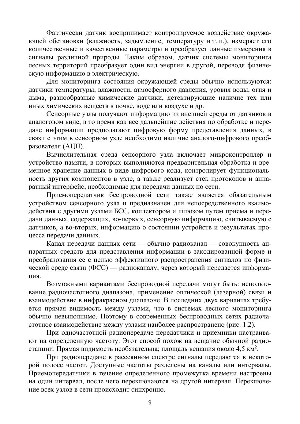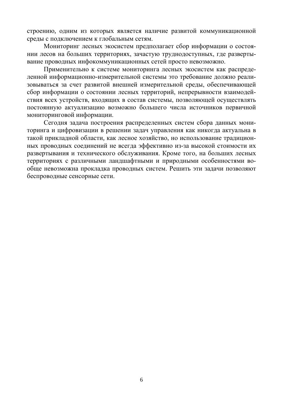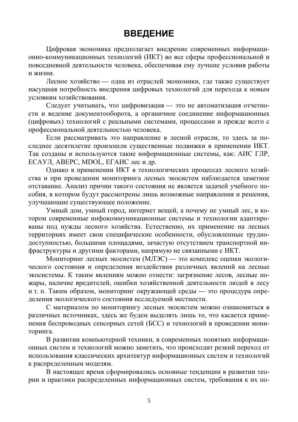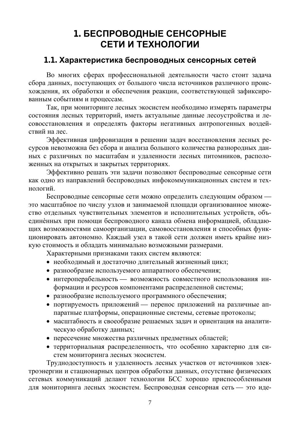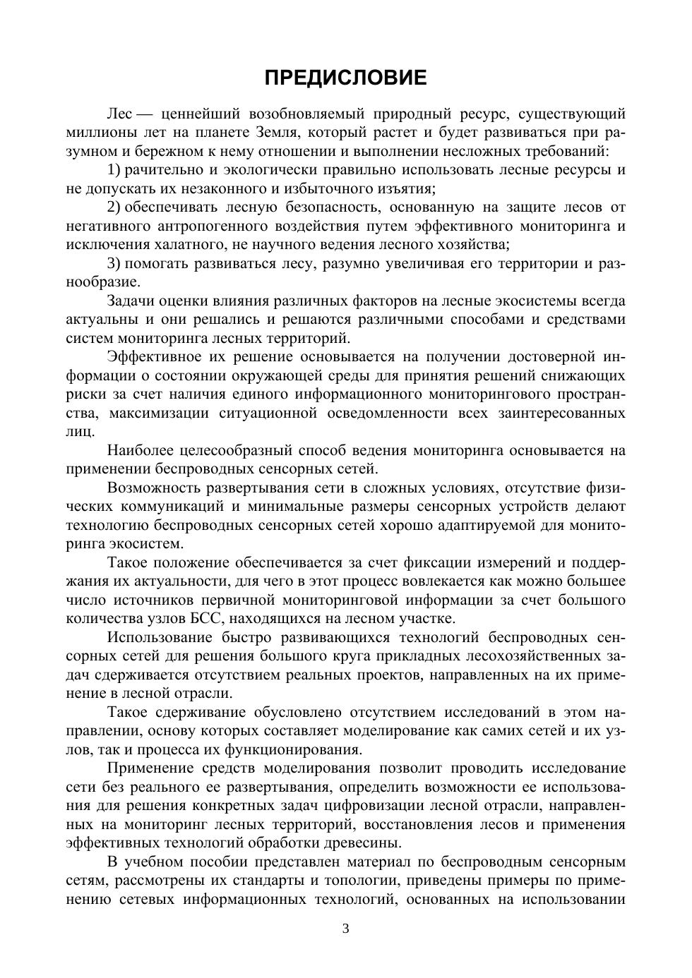В книге представлен материал по беспроводным сенсорным сетям, рассмотрены особенности сенсорных узлов и датчиков, стандарты и топологии БСС. Приведены особенности применения сетевых информационных технологий, основанных на использовании беспроводных сенсорных сетей в различных сферах лесного хозяйства и мониторинге лесных экосистем. Предложены примеры построения и использования беспроводных сенсорных сетей в системе мониторинга лесных территорий и обнаружения пожаров, а также в инфраструктуре лесных питомников. Проведен краткий анализ методов моделирования беспроводных сенсорных сетей и процессов их функционирования. Рассматриваются математическая модель беспроводной сенсорной сети, разработанная на основе теории массового обслуживания и марковских процессов, а также имитационная модель функционирования сети в среде OMNET++.
