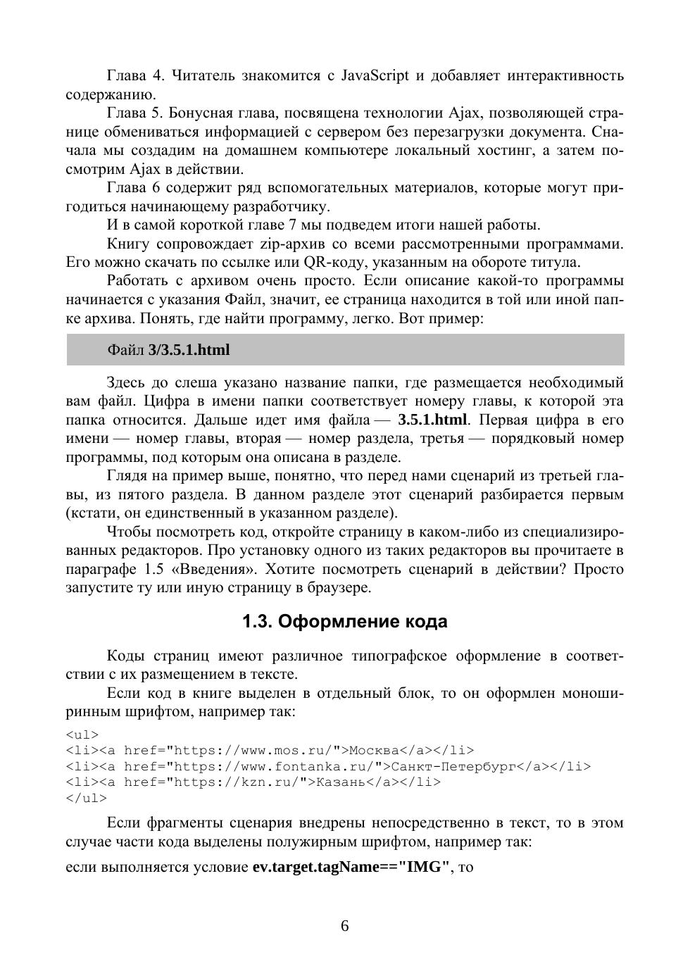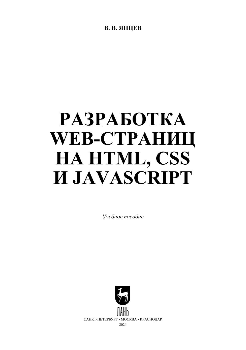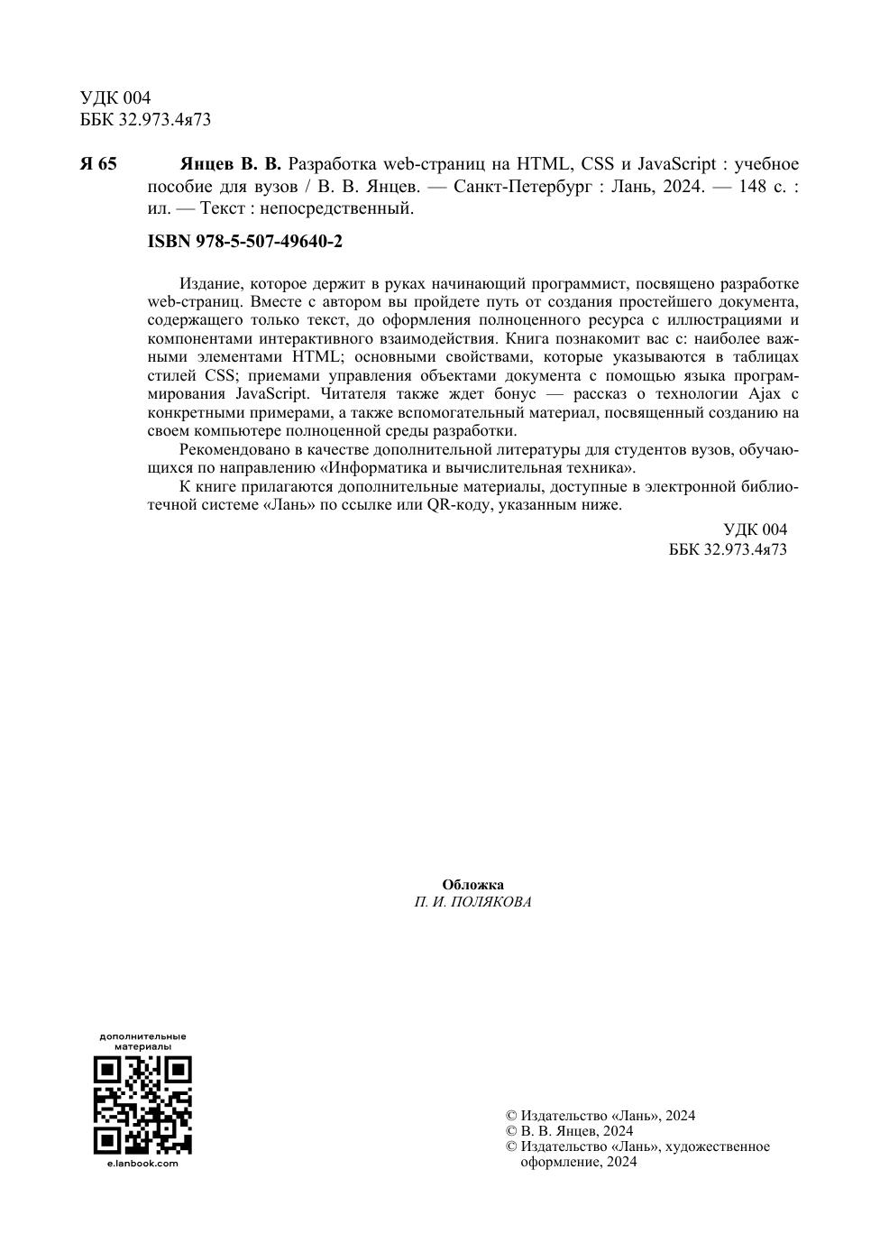 Издание, которое держит в руках начинающий программист, посвящено разработке web-страниц. Вместе с автором вы пройдете путь от создания простейшего документа, содержащего только текст, до оформления полноценного ресурса с иллюстрациями и компонентами интерактивного взаимодействия. Книга познакомит вас с: наиболее важными элементами HTML, основными свойствами, которые указываются в таблицах стилей CSS, приемами управления объектами документа с помощью языка программирования JavaScript. Читателя также ждет бонус — рассказ о технологии Ajax с конкретными примерами, а также вспомогательный материал, посвященный созданию на своем компьютере полноценной среды разработки. Рекомендовано в качестве дополнительной литературы для студентов вузов, обучающихся по направлению «Информатика и вычислительная техника». К книге прилагаются дополнительные материалы, доступные в электронной библиотечной системе «Лань» по ссылке или QR-коду, указанным ниже.