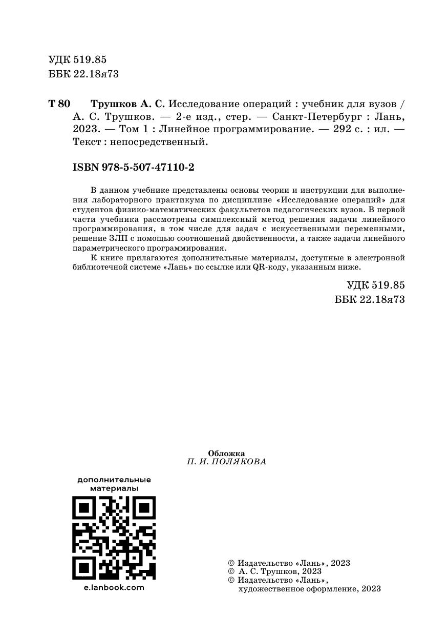 В данном учебном пособии представлены основы теории и инструкции для выполнения лабораторного практикума по дисциплине «Исследование операций» для студентов физико математических факультетов педагогических вузов. В первой части учебного пособия рассмотрены симплексный метод решения задачи линейного программирования, в том числе для задач с искусственными переменными, решение ЗЛП с помощью соотношений двойственности, а также задачи линейного параметрического программирования. К книге прилагаются дополнительные материалы, доступные в электронной библиотечной системе «Лань» по ссылке или QR-коду, указанным ниже.