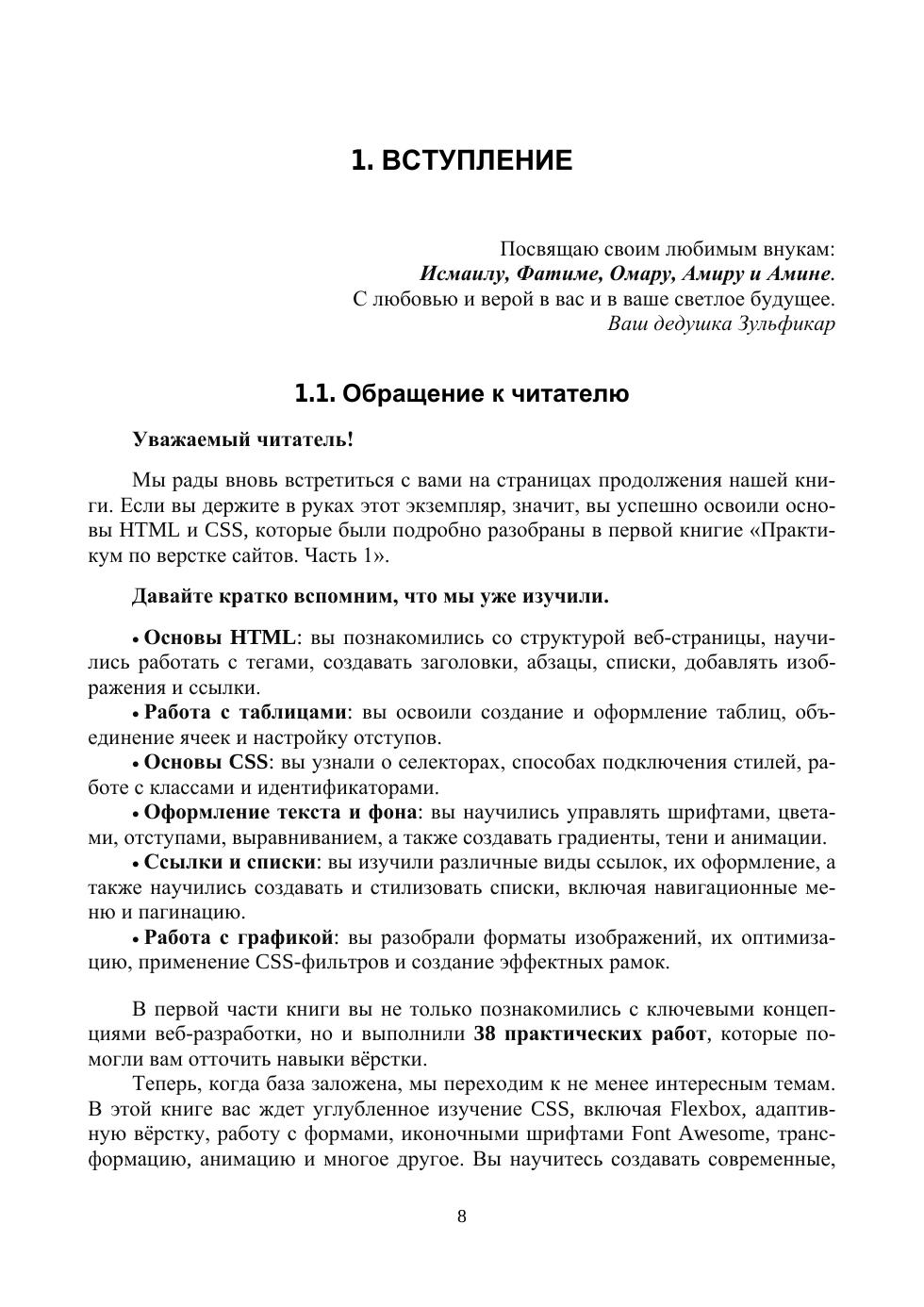 Данное пособие представляет собой подробное руководство по веб-разработке, ориентированное на практическое освоение современных технологий HTML, CSS и немного JavaScript. Учебное пособие является продолжением авторской книги «Практикум по верстке сайтов. Часть 1» и состоит из шести глав: Font Awesome, формы, трансформация и анимация, адаптивный дизайн с Flexbox и справочник свойств CSS. Соответствует современным требованиям Федерального государственного образовательного стандарта среднего профессионального образования и профессиональным квалификационным требованиям. Книга предназначена для тех, кто хочет основательно освоить создание интерактивных интерфейсов и дизайн адаптивных веб-сайтов, а также для начинающих разработчиков, студентов IT-направлений по специальностям СПО: «Информационные системы и программирование» (профиль «Разработчик веб- и мультимедийных приложений»), «Веб-разработка». Но в первую очередь она будет полезна всем желающим углубленно изучить современные инструменты создания веб-интерфейсов. Благодаря ясной структуре и множеству практических заданий, читатель сможет уверенно применять изученные техники в реальных проектах.