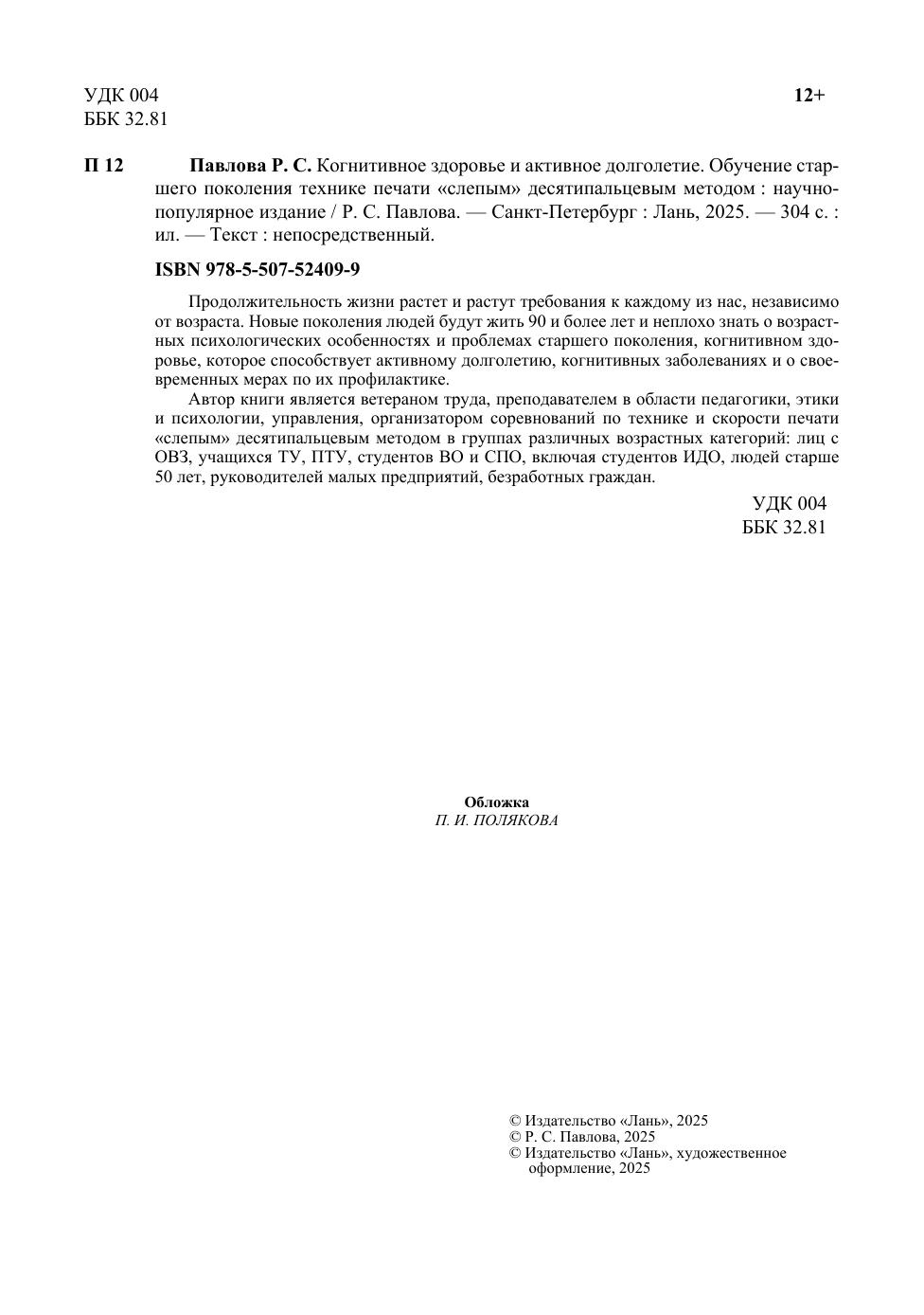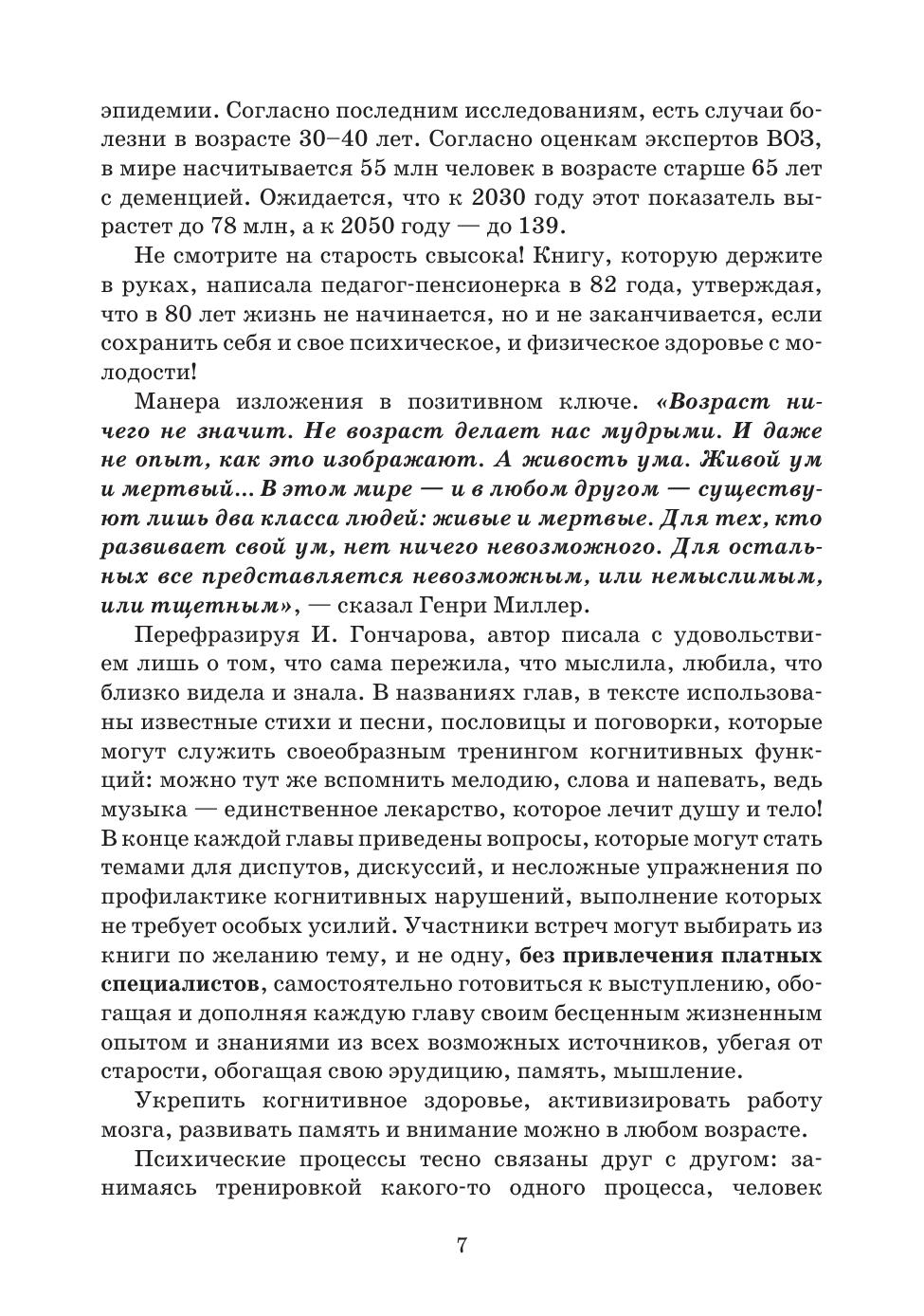 Продолжительность жизни растет и растут требования к каждому из нас, независимо от возраста. Новые поколения людей будут жить 90 и более лет и неплохо знать о возрастных психологических особенностях и проблемах старшего поколения, когнитивном здоровье, которое способствует активному долголетию, когнитивных заболеваниях и о своевременных мерах по их профилактике. Автор книги является ветераном труда, преподавателем в области педагогики, этики и психологии, управления, организатором соревнований по технике и скорости печати «сле-пым» десятипальцевым методом в группах различных возрастных категорий: лиц с ОВЗ, учащихся ТУ, ПТУ, студентов ВО И СПО, включая студентов ИДО, старше 50 лет, руко-водителей малых предприятий, безработных граждан.