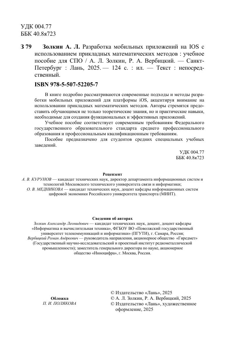 В книге подробно рассматриваются современные подходы и методы разработки мобильных приложений для платформы iOS, акцентируя внимание на использовании прикладных математических методов. Авторы стремятся предоставить обучающимся не только теоретические знания, но и практические навыки, необходимые для создания функциональных и эффективных приложений. Учебное пособие соответствует современным требованиям Федерального государственного образовательного стандарта среднего профессионального образования и профессиональным квалификационным требованиям. Пособие предназначено для студентов средних специальных учебных заведений.