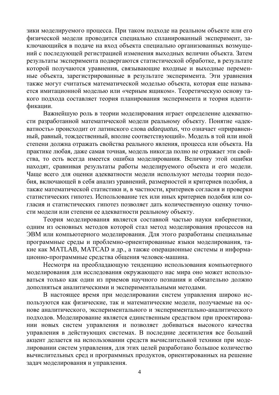 Рассматриваются основы моделирования систем управления с использованием линейных непрерывных и импульсных динамических моделей, математических моделей случайных процессов, нелинейных и нейросетевых моделей. Затрагиваются вопросы теории подобия и теории размерностей. Приводятся основные методы идентификации объектов управления, показаны особенности применения временных, частотных, спектральных, стохастических непараметрических и параметрических методов идентификации. На основе теории оценок и проверки статистических гипотез проводятся обработка и анализ результатов моделирования. Изложение сопровождается многочисленными примерами, поясняющими технологию использования MATLAB для решения задач моделирования и идентификации. Для обучающихся по техническим направлениям подготовки в высшей школе, аспирантов, инженеров и научных работников, занимающихся проектированием и эксплуатацией систем управления.