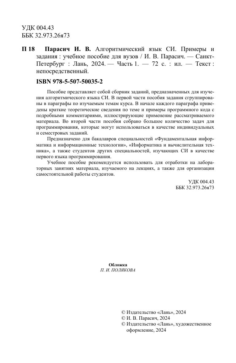 Пособие представляет собой сборник заданий, предназначенных для изучения алгоритмического языка СИ. В первой части пособия задания сгруппированы в параграфы по изучаемым темам курса. В начале каждого параграфа приведены краткие теоретические сведения по теме и примеры программного кода с подробными комментариями, иллюстрирующие применение рассматриваемого материала. Во второй части пособия собрано большое количество задач для программирования, которые могут использоваться в качестве индивидуальных и семестровых заданий. Предназначено для бакалавров специальностей «Фундаментальная информатика и информационные технологии», «Информатика и вычислительная техника», а также студентов других специальностей, изучающих СИ в качестве первого языка программирования. Учебное пособие рекомендуется использовать для отработки на лабораторных занятиях материала, изучаемого на лекциях, а также для организации самостоятельной работы студентов.