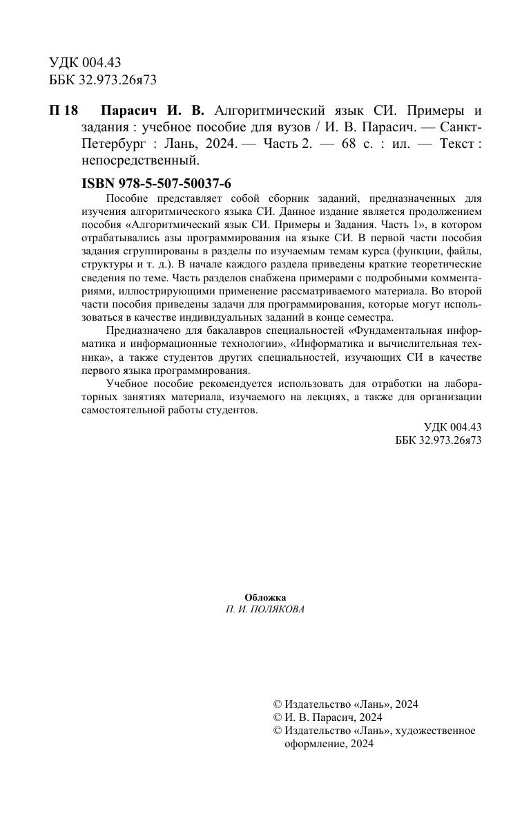 Пособие представляет собой сборник заданий, предназначенных для изучения алгоритмического языка СИ. Данное издание является продолжением пособия «Алгоритмический язык СИ. Примеры и Задания. Часть 1», в котором отрабатывались азы программирования на языке СИ. В первой части пособия задания сгруппированы в разделы по изучаемым темам курса (функции, файлы, структуры и т. д.). В начале каждого раздела приведены краткие теоретические сведения по теме. Часть разделов снабжена примерами с подробными комментариями, иллюстрирующими применение рассматриваемого материала. Во второй части пособия приведены задачи для программирования, которые могут использоваться в качестве индивидуальных заданий в конце семестра. Предназначено для бакалавров специальностей «Фундаментальная информатика и информационные технологии», «Информатика и вычислительная техника», а также студентов других специальностей, изучающих СИ в качестве первого языка программирования. Учебное пособие рекомендуется использовать для отработки на лабораторных занятиях материала, изучаемого на лекциях, а также для организации самостоятельной работы студентов.