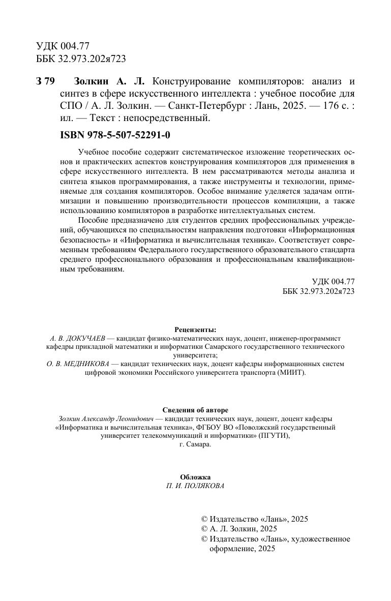 Учебное пособие содержит систематическое изложение теоретических основ и практических аспектов конструирования компиляторов для применения в сфере искусственного интеллекта. В нем рассматриваются методы анализа и синтеза языков программирования, а также инструменты и технологии, применяемые для создания компиляторов. Особое внимание уделяется задачам оптимизации и повышению производительности процессов компиляции, а также использованию компиляторов в разработке интеллектуальных систем. Пособие предназначено для студентов средних профессиональных учреждений, обучающихся по специальностям направления подготовки «Информационная безопасность» и «Информатика и вычислительная техника». Соответствует современным требованиям Федерального государственного образовательного стандарта среднего профессионального образования и профессиональным квалификационным требованиям.