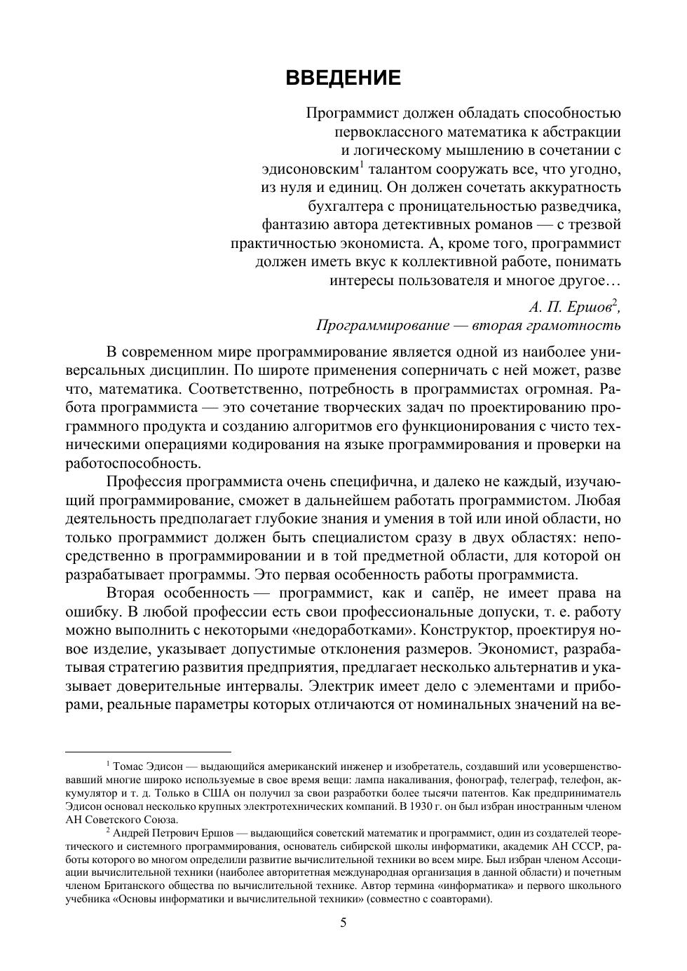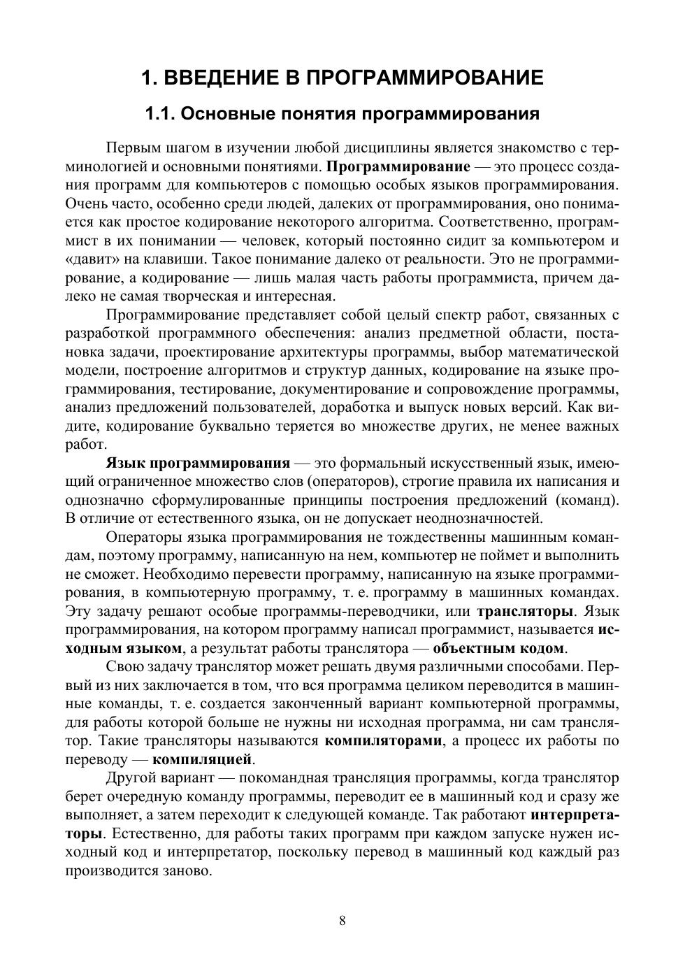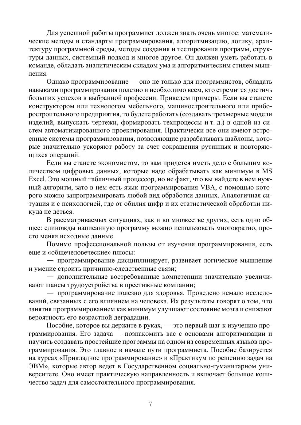 Учебное пособие является введением в алгоритмизацию и программирование. Оно имеет практическую направленность и включает в себя теоретические сведения и большое количество практических примеров программ на языке Python. Серьезное внимание уделяется разбору примеров решения задач и написания программ, а также самостоятельной работе обучающихся, для чего разработано большое количество вариантов дополнительных заданий. Пособие предназначено для студентов высших учебных заведений, изучающих информационные технологии и программирование.