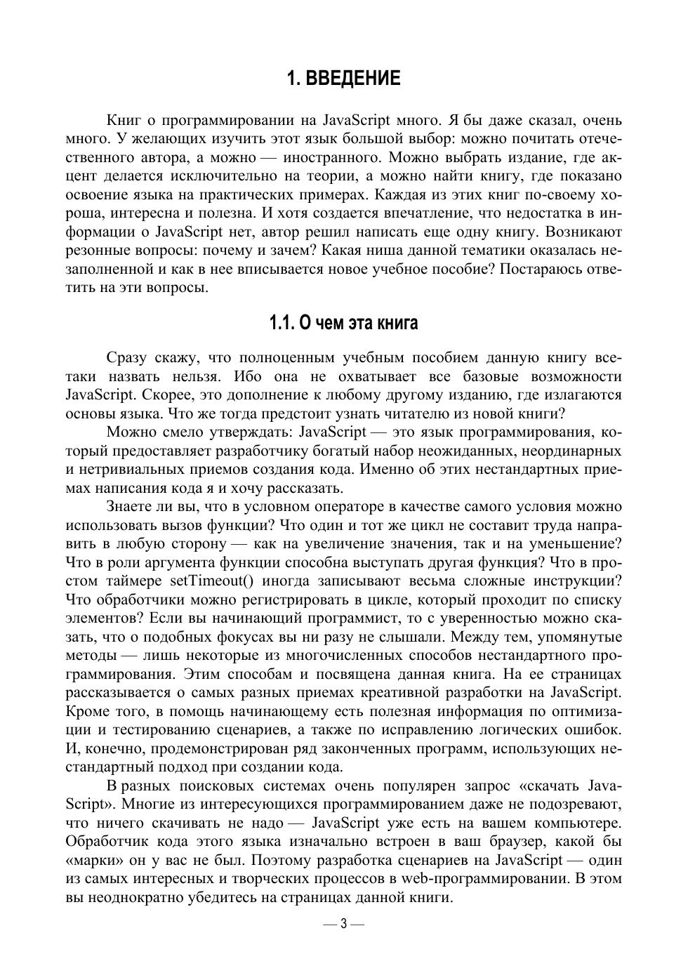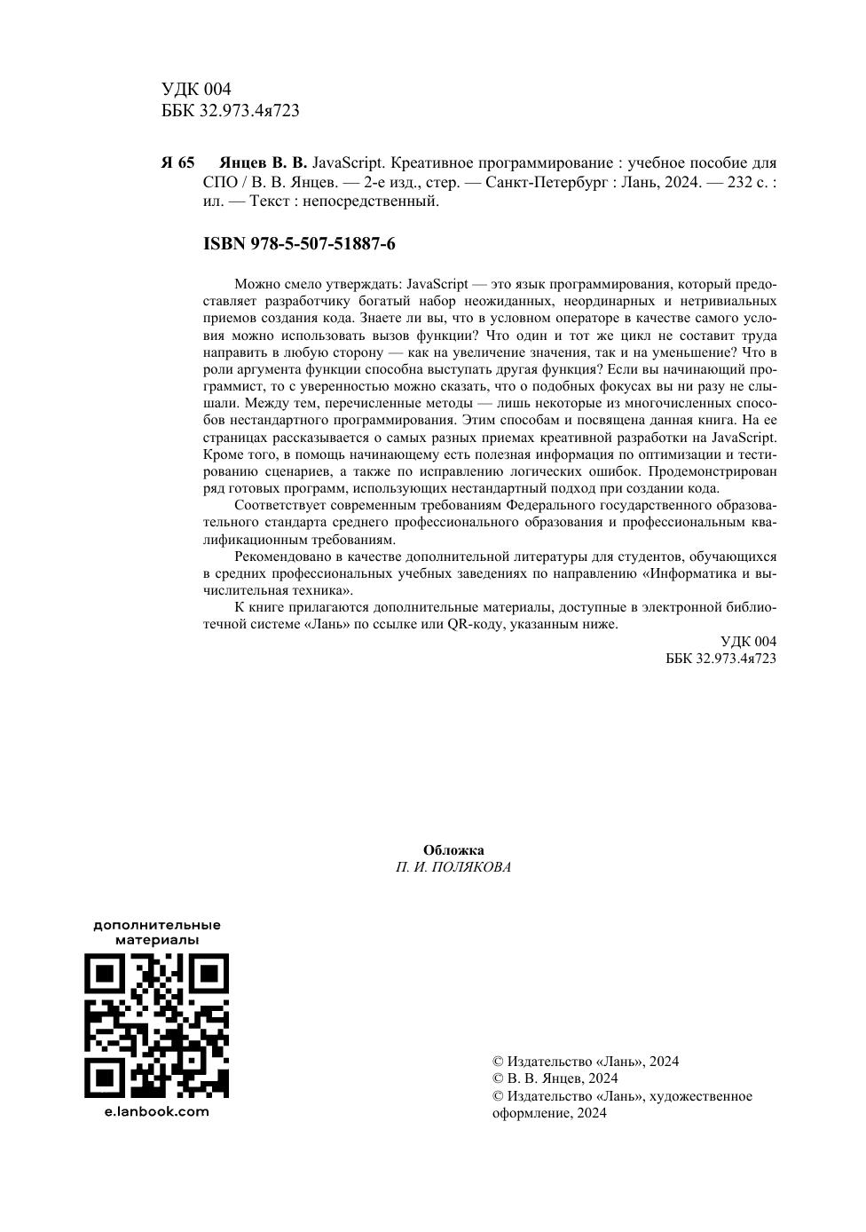 Можно смело утверждать: JavaScript — это язык программирования, который предоставляет разработчику богатый набор неожиданных, неординарных и нетривиальных приемов создания кода. Знаете ли вы, что в условном операторе в качестве самого условия можно использовать вызов функции? Что один и тот же цикл не составит труда направить в любую сторону — как на увеличение значения, так и на уменьшение? Что в роли аргумента функции способна выступать другая функция? Если вы начинающий программист, то с уверенностью можно сказать, что о подобных фокусах вы ни разу не слышали. Между тем, перечисленные методы — лишь некоторые из многочисленных способов нестандартного программирования. Этим способам и посвящена данная книга. На ее страницах рассказывается о самых разных приемах креативной разработки на JavaScript. Кроме того, в помощь начинающему есть полезная информация по оптимизации и тестированию сценариев, а также по исправлению логических ошибок. Продемонстрирован ряд готовых программ, использующих нестандартный подход при создании кода. Соответствует современным требованиям Федерального государственного образовательного стандарта среднего профессионального образования и профессиональным квалификационным требованиям. Рекомендовано в качестве дополнительной литературы для студентов, обучающихся в средних профессиональных учебных заведениях по направлению «Информатика и вычислительная техника». К книге прилагаются дополнительные материалы, доступные в электронной библиотечной системе «Лань» по ссылке или QR-коду, указанным ниже.