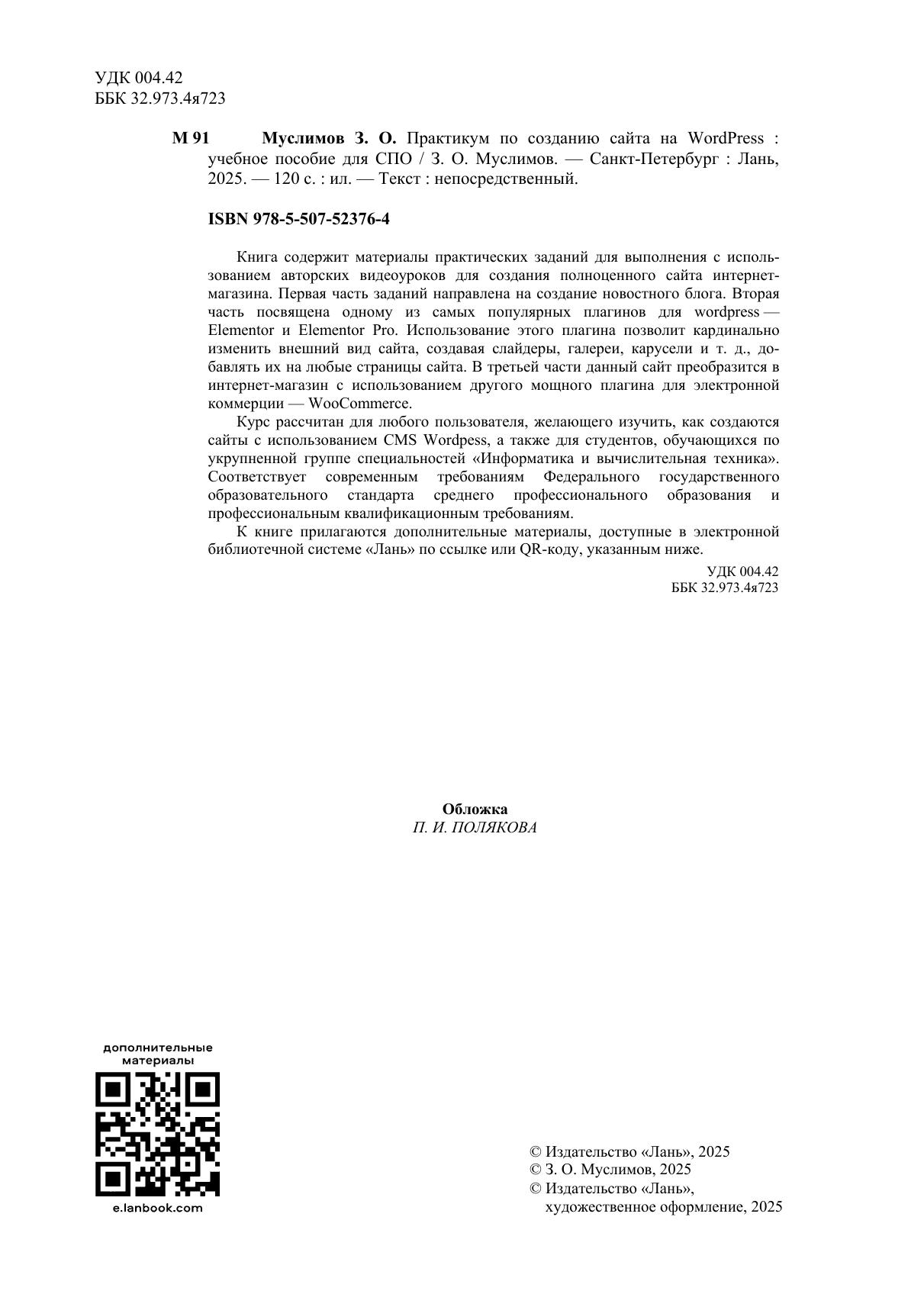 Книга содержит материалы практических заданий для выполнения с использованием авторских видеоуроков для создания полноценного сайта интернет-магазина. Первая часть заданий направлена на создание новостного блога. Вторая часть посвящена одному из самых популярных плагинов для wordpress — Elementor и Elementor Pro. Использование этого плагина позволит кардинально изменить внешний вид сайта, создавая слайдеры, галереи, карусели и т. д., добавлять их на любые страницы сайта. В третьей части данный сайт преобразится в интернет-магазин с использованием другого мощного плагина для электронной коммерции — WooCommerce. Курс рассчитан для любого пользователя, желающего изучить, как создаются сайты с использованием CMS Wordpess, а также для студентов, обучающихся по укрупненной группе специальностей «Информатика и вычислительная техника». Соответствует современным требованиям Федерального государственного образовательного стандарта среднего профессионального образования и профессиональным квалификационным требованиям. К книге прилагаются дополнительные материалы, доступные в электронной библиотечной системе «Лань» по ссылке или QR-коду, указанным ниже.
