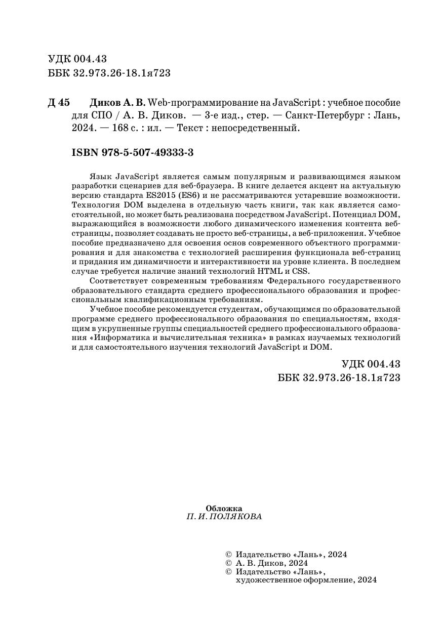 Язык JavaScript является самым популярным и развивающимся языком разработки сценариев для веб-браузера. В книге делается акцент на актуальную версию стандарта ES2015 (ES6) и не рассматриваются устаревшие возможности. Технология DOM выделена в отдельную часть книги, так как является самостоятельной, но может быть реализована посредством JavaScript. Потенциал DOM, выражающийся в возможности любого динамического изменения контента веб-страницы, позволяет создавать не просто веб-страницы, а веб-приложения. Учебное пособие предназначено и для освоения основ современного объектного программирования и для знакомства с технологией расширения функционала веб-страниц и придания им динамичности и интерактивности на уровне клиента. В последнем случае требуется наличие знаний технологий HTML и CSS. Соответствует современным требованиям Федерального государственного образовательного стандарта среднего профессионального образования и профессиональным квалификационным требованиям. Учебное пособие рекомендуется студентам, обучающимся по образовательной программе среднего профессионального образования по специальностям, входящим в укрупненные группы специальностей среднего профессионального образования «Информатика и вычислительная техника» в рамках изучаемых технологий и для самостоятельного изучения технологий JavaScript и DOM.