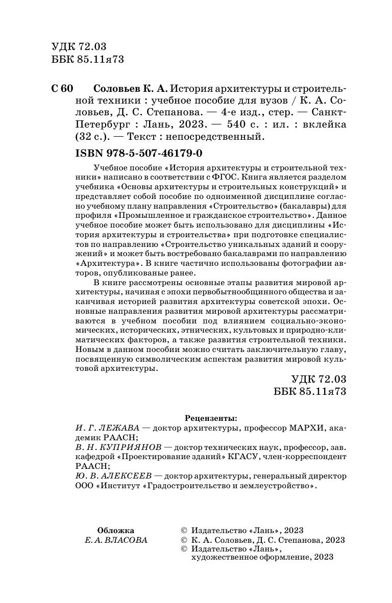 Учебное пособие «История архитектуры и строительной техники» написано в соответствии с ФГОС. Книга является разделом учебника «Основы архитектуры и строительных конструкций» и представляет собой пособие по одноименной дисциплине согласно учебному плану направления «Строительство» (бакалавры) для профиля «Промышленное и гражданское строительство». Данное учебное пособие может быть использовано для дисциплины «История архитектуры и строительства» при подготовке специалистов по направлению «Строительство уникальных зданий и сооружений» и может быть востребовано бакалаврами по направлению «Архитектура». В книге частично использованы фотографии авторов, опубликованые ранее. В книге рассмотрены основные этапы развития мировой архитектуры начиная с эпохи первобытнообщинного общества и заканчивая историей развития архитектуры советской эпохи. Основные направления развития мировой архитектуры рассматриваются в учебном пособии под влиянием социально-экономических, исторических, этнических, культовых и природно-климатических факторов, а также развития строительной техники. Новым в данном пособии можно считать заключительную главу, посвященную символическим аспектам развития мировой культовой архитектуры.