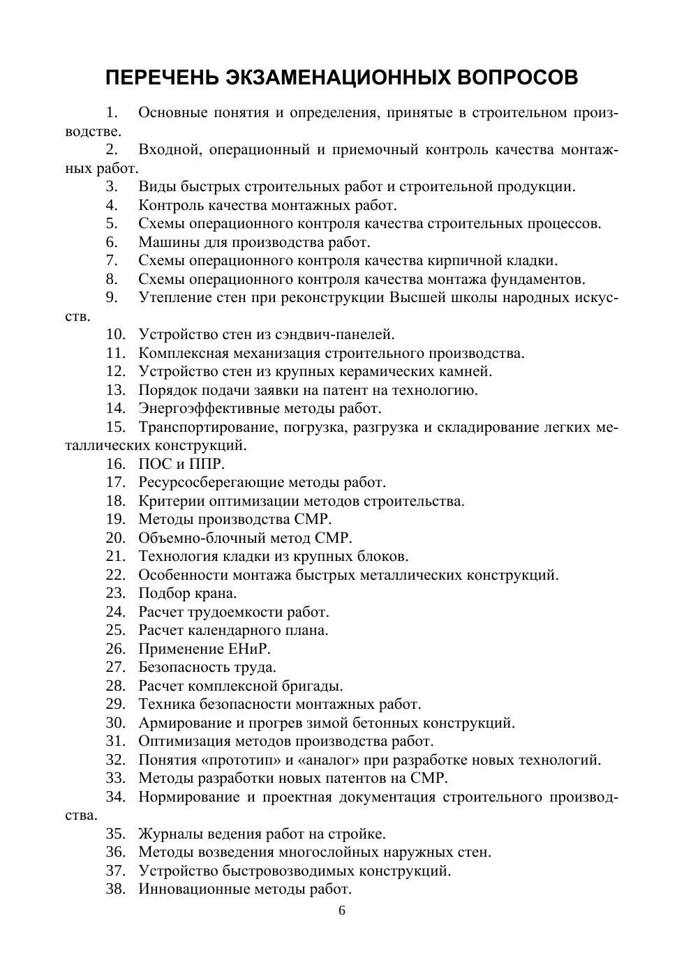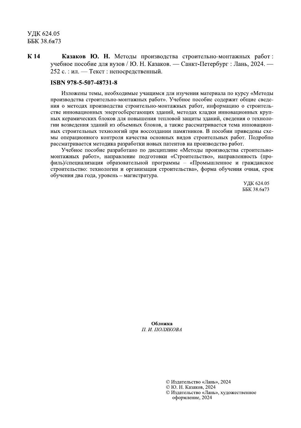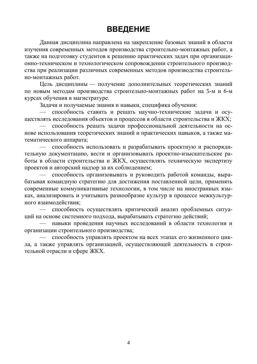 Изложены темы, необходимые учащимся для изучения материала по курсу «Методы производства строительно-монтажных работ». Учебное пособие содержит общие сведения о методах производства строительно-монтажных работ, информацию о строительстве инновационных энергосберегающих зданий, методах кладки инновационных крупных керамических блоков для повышения тепловой защиты зданий, сведения о технологии возведения зданий из объемных блоков, а также рассматривается тема инновационных строительных технологий при воссоздании памятников. В пособии приведены схемы операционного контроля качества основных видов строительных работ. Подробно рассматривается методика разработки новых патентов на производство работ. Учебное пособие разработано по дисциплине «Методы производства строительно-монтажных работ», направление подготовки «Строительство», направленность (профиль)/специализация образовательной программы – «Промышленное и гражданское строительство: технологии и организация строительства», форма обучения очная, срок обучения два года, уровень – магистратура.