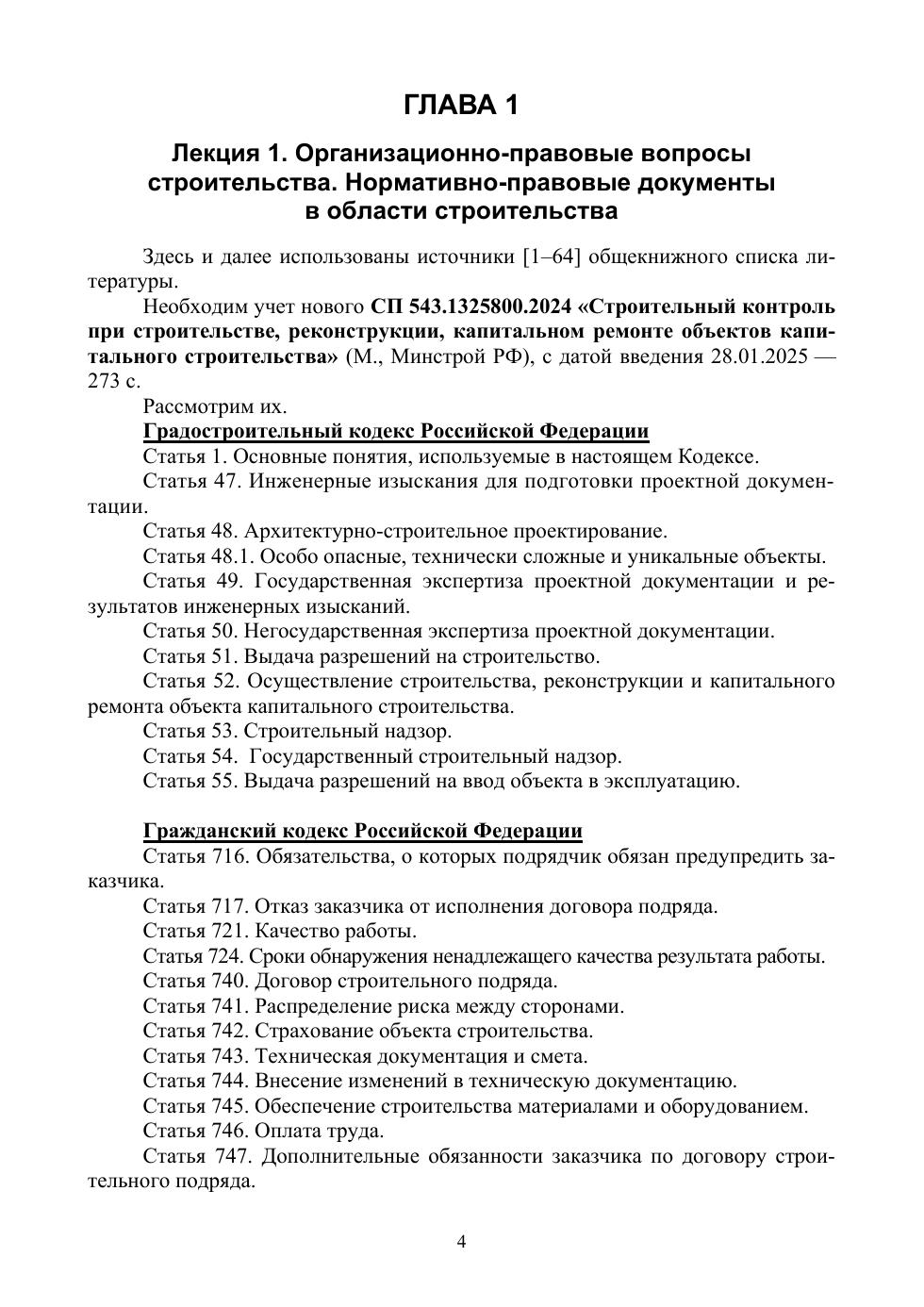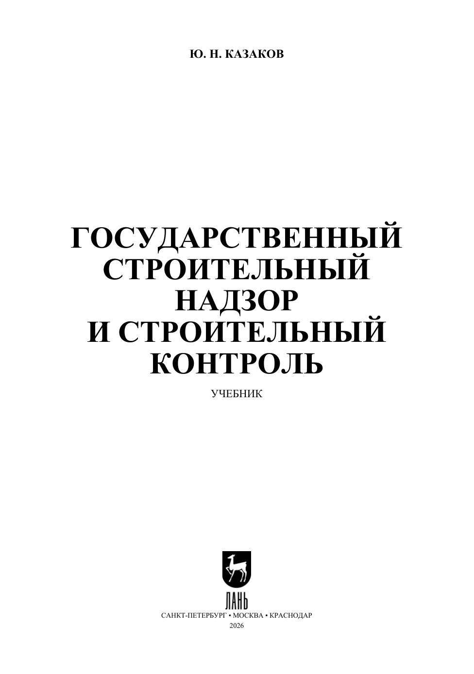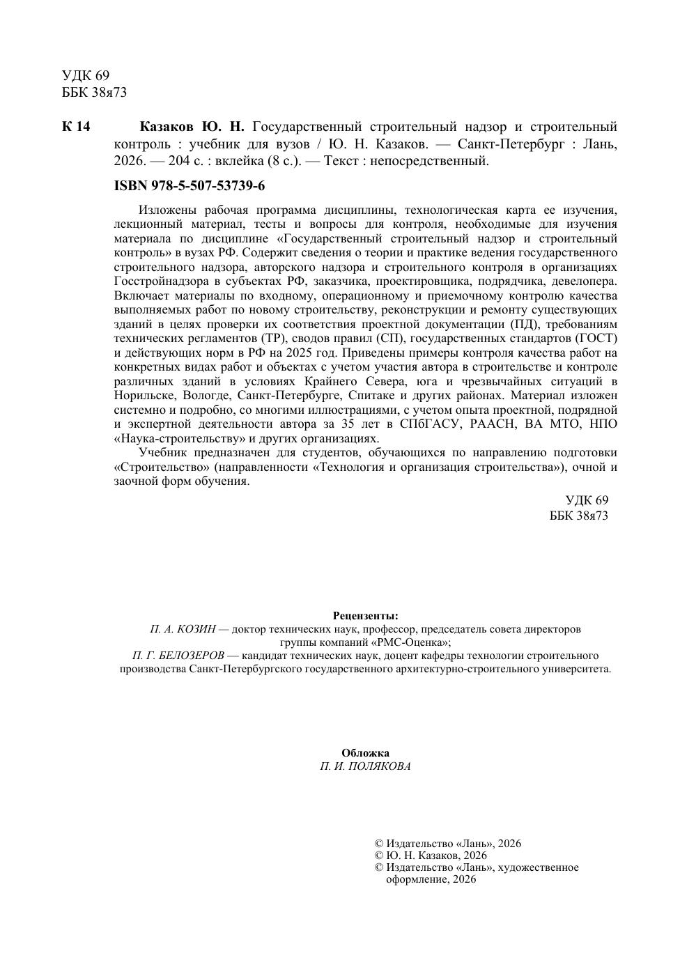 Изложены рабочая программа дисциплины, технологическая карта ее изучения, лекционный материал, тесты и вопросы для контроля, необходимые для изучения материала по дисциплине Государственный строительный надзор и строительный контроль» в вузах РФ. Содержит сведения о теории и практике ведения государственного строительного надзора, авторского надзора и строительного контроля в организациях Госстройнадзора в субъектах РФ, заказчика, проектировщика, подрядчика, девелопера. Включает материалы по входному, операционному и приемочному контролю качества выполняемых работ по новому строительству, реконструкции и ремонту существующих зданий в целях проверки их соответствия проектной документации (ПД), требованиям технических регламентов (ТР), сводов правил (СП), государственных стандартов (ГОСТ) и действующих норм в РФ на 2025 год. Приведены примеры контроля качества работ на конкретных видах работ и объектах с учетом участия автора в строительстве и контроле различных зданий в условиях Крайнего Севера, юга и чрезвычайных ситуаций в Норильске, Вологде, Санкт-Петербурге, Спитаке и других районах. Материал изложен системно и подробно, со многими иллюстрациями, с учетом опыта проектной, подрядной и экспертной деятельности автора за 35 лет в СПбГАСУ, РААСН, ВА МТО, НПО «Наука-строительству» и других организациях. Учебник предназначен для студентов, обучающихся по направлению подготовки «Строительство» (направленности «Технология и организация строительства»), очной и заочной форм обучения.