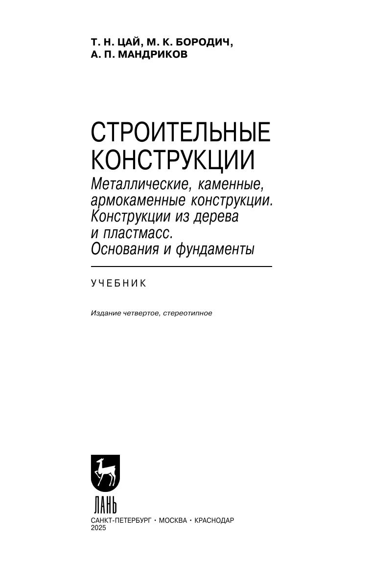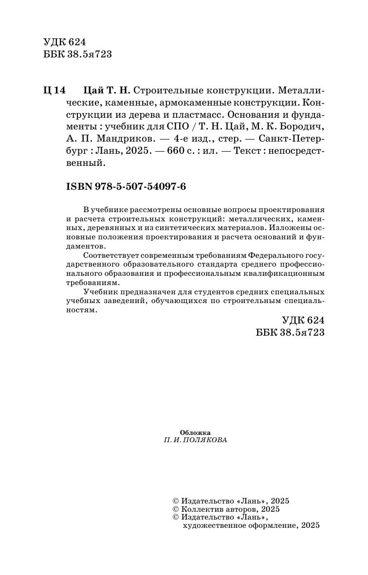 В учебнике рассмотрены основные вопросы проектирования и расчета строительных конструкций: металлических, каменных, деревянных и из синтетических материалов. Изложены основные положения проектирования и расчета оснований и фундаментов. Учебник предназначен для студентов средних специальных учебных заведений, обучающихся по строительным специальностям. Соответствует современным требованиям Федерального государственного образовательного стандарта среднего профессионального образования и профессиональным квалификационным требованиям.