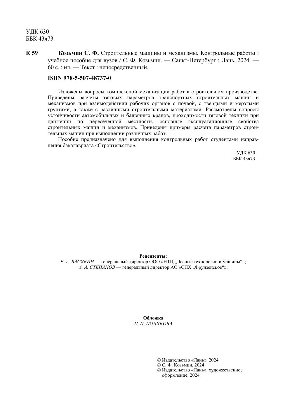 Изложены вопросы комплексной механизации работ в строительном производстве. Приведены расчеты тяговых параметров транспортных строительных машин и механизмов при взаимодействии рабочих органов с почвой, с твердыми и мерзлыми грунтами, а также с различными строительными материалами. Рассмотрены вопросы устойчивости автомобильных и башенных кранов, проходимости тяговой техники при движении по пересеченной местности, основные эксплуатационные свойства строительных машин и механизмов. Приведены примеры расчета параметров строительных машин при выполнении различных работ. Пособие предназначено для выполнения контрольных работ студентами направления бакалавриата «Строительство».