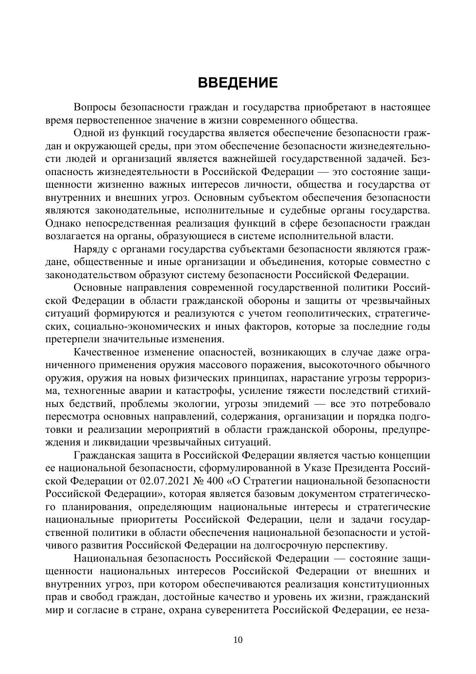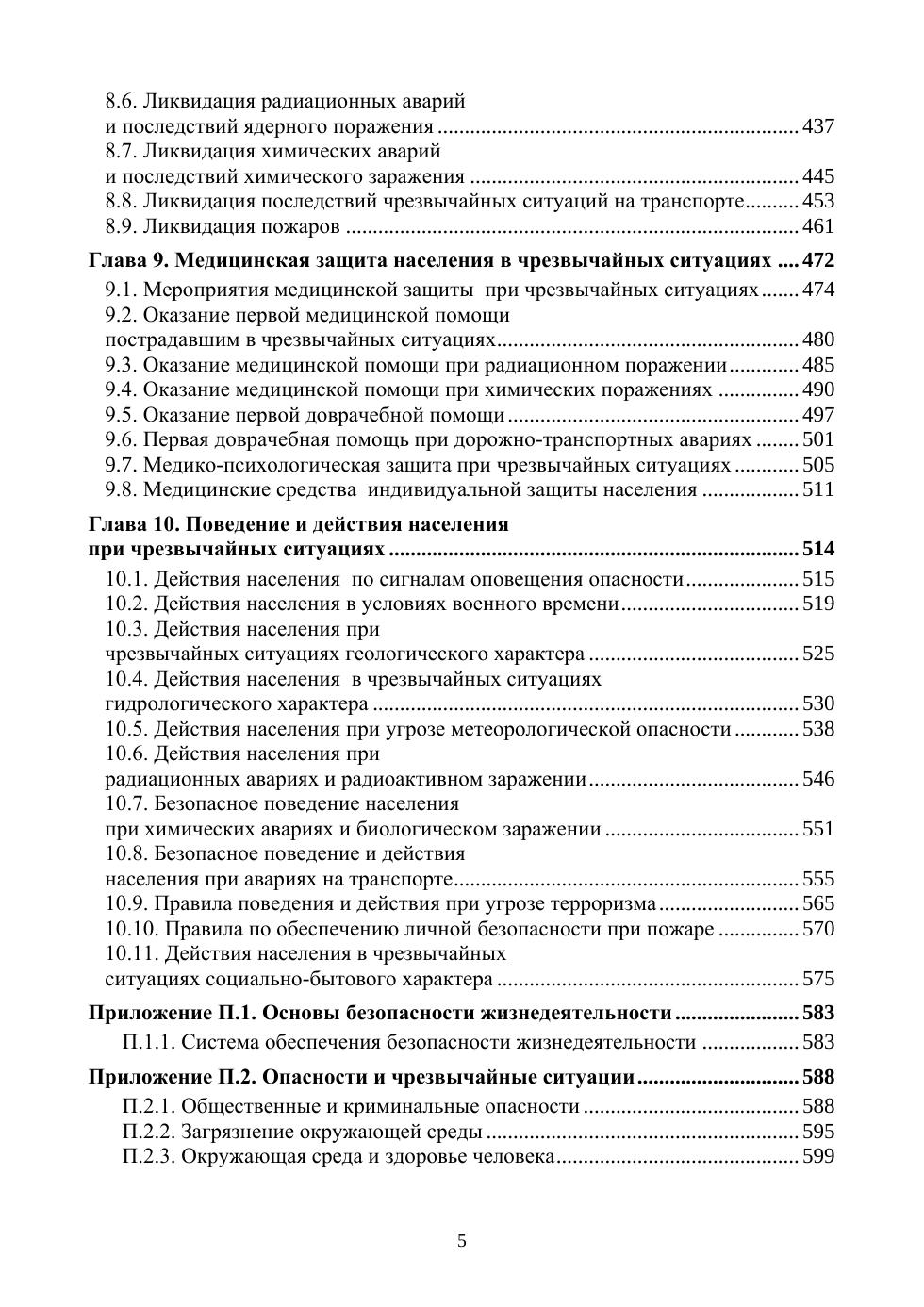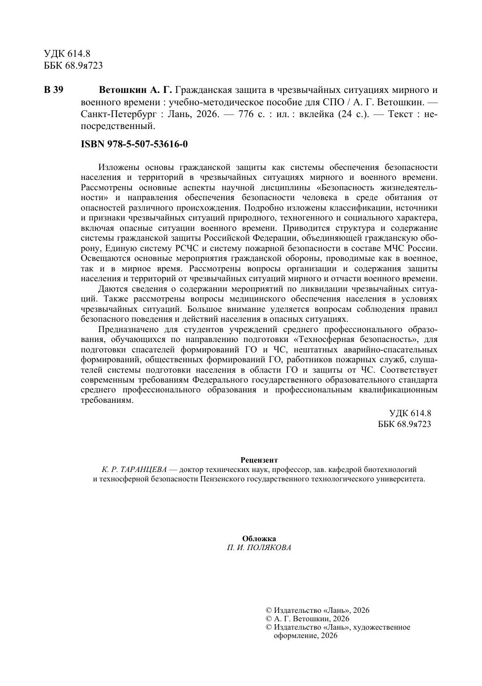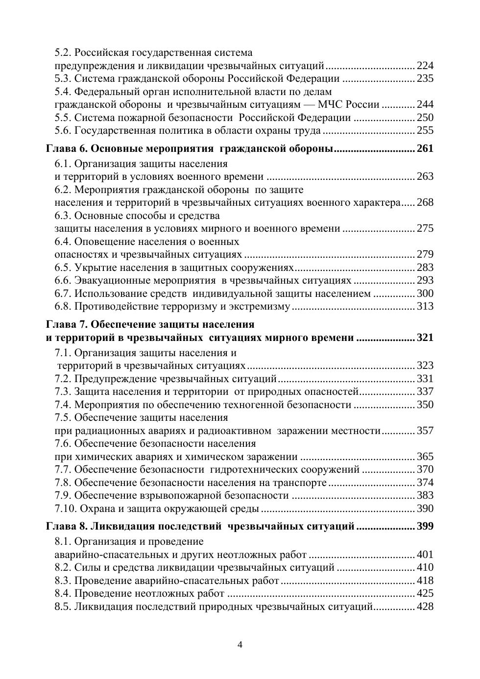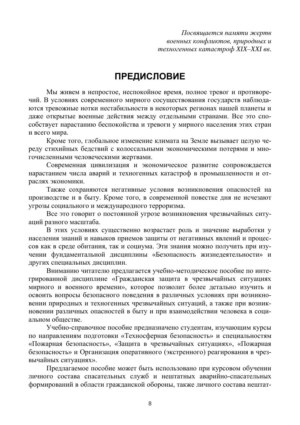 Изложены основы гражданской защиты как системы обеспечения безопасности населения и территорий в чрезвычайных ситуациях мирного и военного времени. Рассмотрены основные аспекты научной дисциплины «Безопасность жизнедеятельности» и направления обеспечения безопасности человека в среде обитания от опасностей различного происхождения. Подробно изложены классификации, источники и признаки чрезвычайных ситуаций природного, техногенного и социального характера, включая опасные ситуации военного времени. Приводится структура и содержание системы гражданской защиты Российской Федерации, объединяющей гражданскую оборону, Единую систему РСЧС и систему пожарной безопасности в составе МЧС России. Освещаются основные мероприятия гражданской обороны, проводимые как в военное, так и в мирное время. Рассмотрены вопросы организации и содержания защиты населения и территорий от чрезвычайных ситуаций мирного и отчасти военного времени. Даются сведения о содержании мероприятий по ликвидации чрезвычайных ситуаций. Также рассмотрены вопросы медицинского обеспечения населения в условиях чрезвычайных ситуаций. Большое внимание уделяется вопросам соблюдения правил безопасного поведения и действий населения в опасных ситуациях. Предназначено для студентов учреждений среднего профессионального образования, обучающихся по направлению подготовки «Техносферная безопасность», для подготовки спасателей формирований ГО и ЧС, нештатных аварийно-спасательных формирований, общественных формирований ГО, работников пожарных служб, слушателей системы подготовки населения в области ГО и защиты от ЧС. Соответствует современным требованиям Федерального государственного образовательного стандарта среднего профессионального образования и профессиональным квалификационным требованиям.
