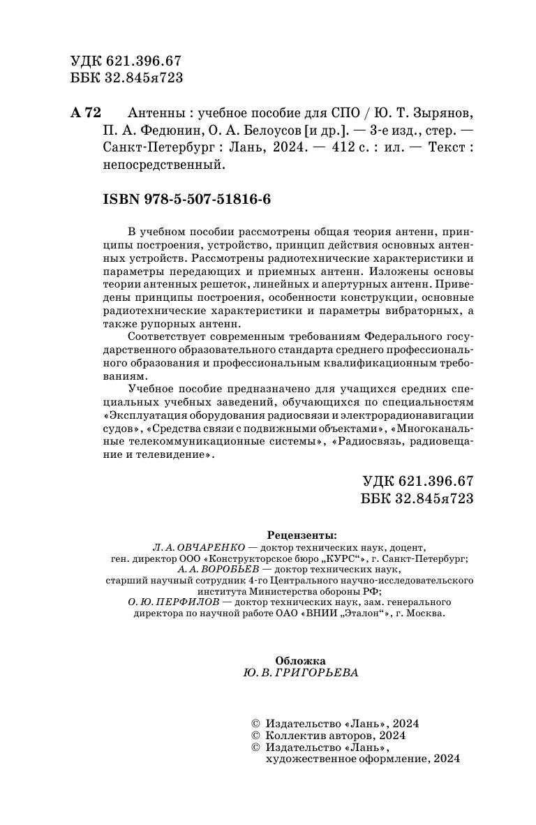 В учебном пособии рассмотрены общая теория антенн, принципы построения, устройство, принцип действия основных антенных устройств. Рассмотрены радиотехнические характеристики и параметры передающих и приемных антенн. Изложены основы теории антенных решеток, линейных и апертурных антенн. Приведены принципы построения, особенности конструкции, основные радиотехнические характеристики и параметры вибраторных, а также рупорных антенн. Соответствует современным требованиям Федерального государственного образовательного стандарта среднего профессионального образования и профессиональным квалификационным требованиям. Учебное пособие предназначено для учащихся средних специальных учебных заведений, обучающихся по специальностям «Эксплуатация оборудования радиосвязи и электрорадионавигации судов», «Средства связи с подвижными объектами», «Многоканальные телекоммуникационные системы», «Радиосвязь, радиовещание и телевидение».
