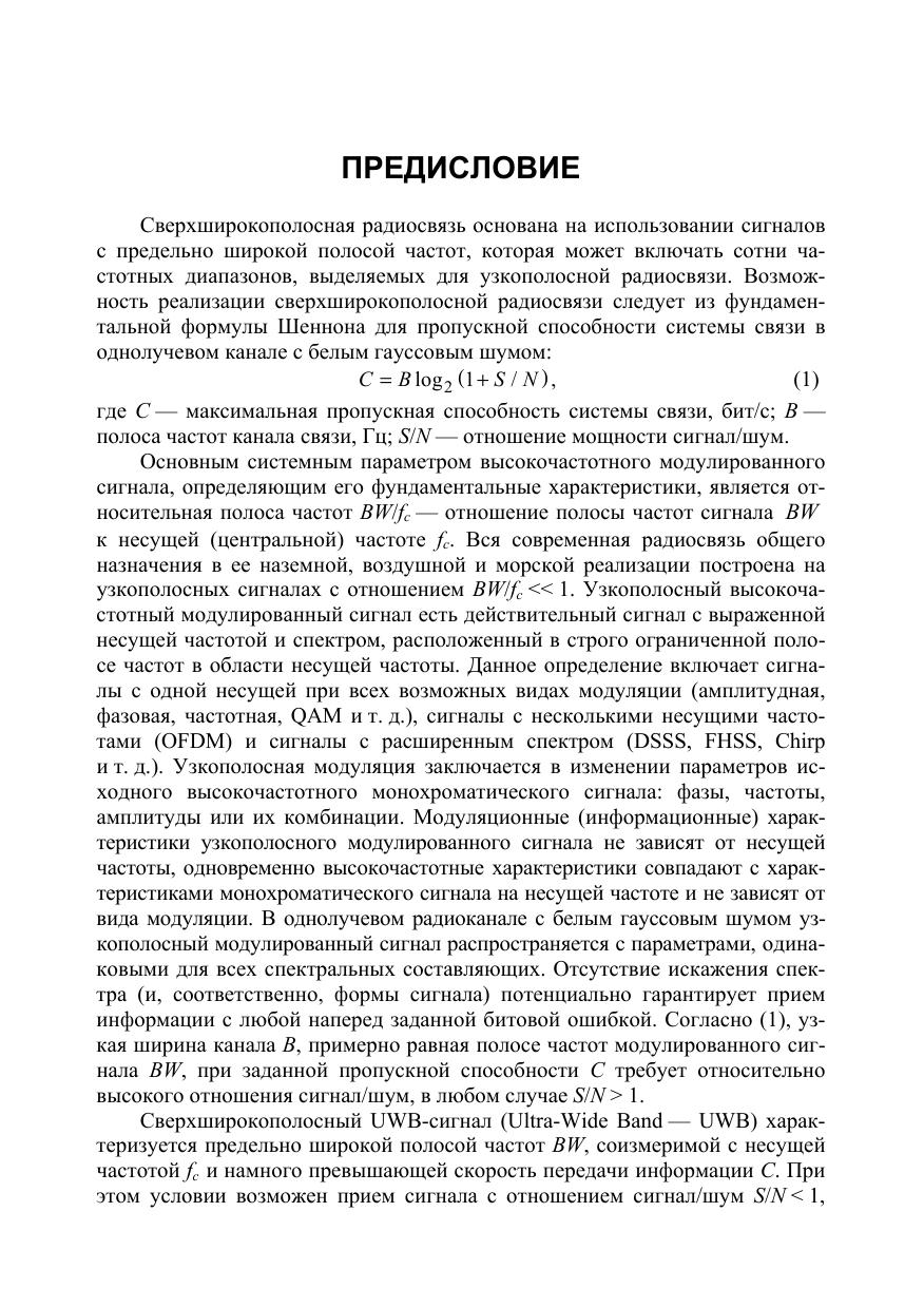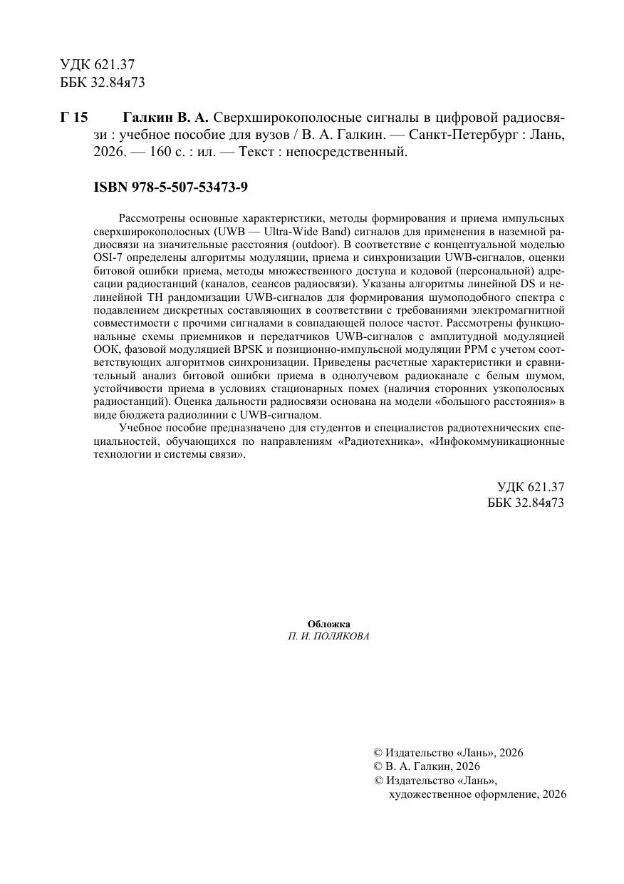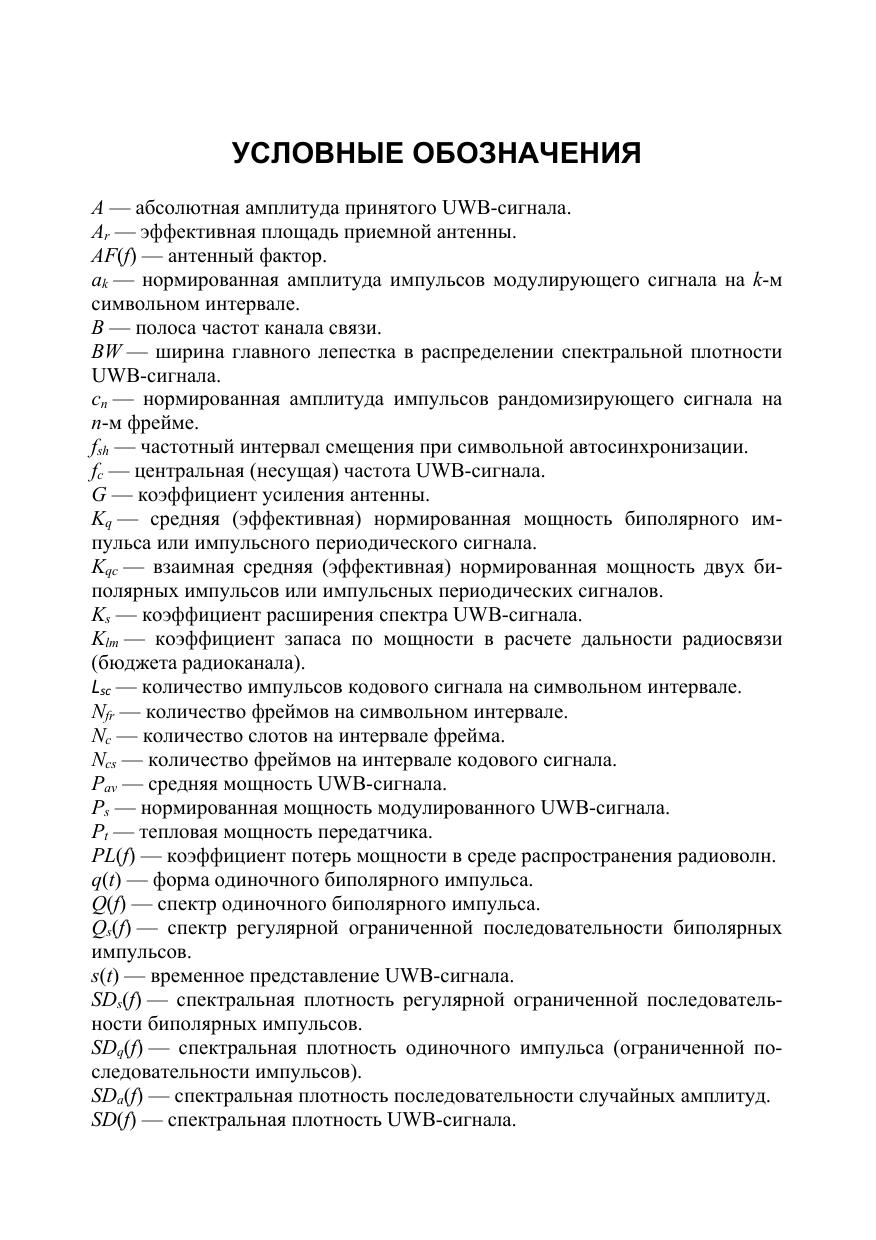 Рассмотрены основные характеристики, методы формирования и приема импульсных сверхширокополосных (UWB — Ultra-Wide Band) сигналов для применения в наземной радиосвязи на значительные расстояния (outdoor). В соответствие с концептуальной моделью OSI-7 определены алгоритмы модуляции, приема и синхронизации UWB-сигналов, оценки битовой ошибки приема, методы множественного доступа и кодовой (персональной) адресации радиостанций (каналов, сеансов радиосвязи). Указаны алгоритмы линейной DS и нелинейной TH рандомизации UWB-сигналов для формирования шумоподобного спектра с подавлением дискретных составляющих в соответствии с требованиями электромагнитной совместимости с прочими сигналами в совпадающей полосе частот. Рассмотрены функциональные схемы приемников и передатчиков UWB-сигналов с амплитудной модуляцией ООК, фазовой модуляцией BPSK и позиционно-импульсной модуляции РРМ с учетом соответствующих алгоритмов синхронизации. Приведены расчетные характеристики и сравнительный анализ битовой ошибки приема в однолучевом радиоканале с белым шумом, устойчивости приема в условиях стационарных помех (наличия сторонних узкополосных радиостанций). Оценка дальности радиосвязи основана на модели «большого расстояния» в виде бюджета радиолинии с UWB-сигналом. Учебное пособие предназначено для студентов и специалистов радиотехнических специальностей, обучающихся по направлениям «Радиотехника», «Инфокоммуникационные технологии и системы связи».