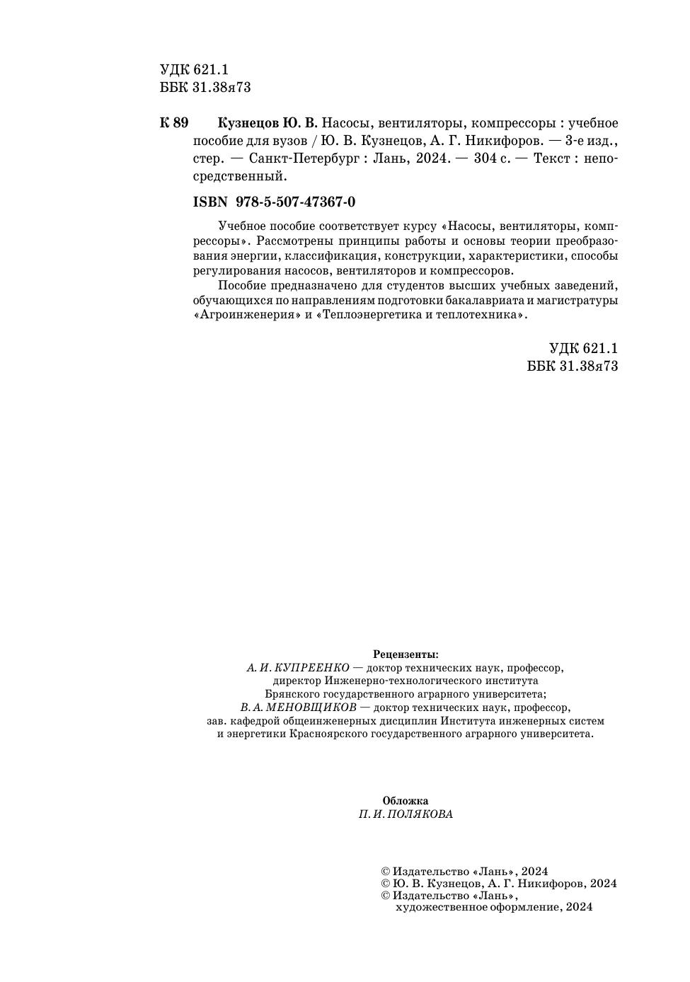 Учебное пособие соответствует курсу «Насосы, вентиляторы, компрессоры». Рассмотрены принципы работы и основы теории преобразования энергии, классификация, конструкции, характеристики, способы регулирования насосов, вентиляторов и компресоров. Пособие предназначено для студентов высших учебных заведений, обучающихся по направлениям подготовки бакалавриата и магистратуры «Агроинженерия» и «Теплоэнергетика и теплотехника».