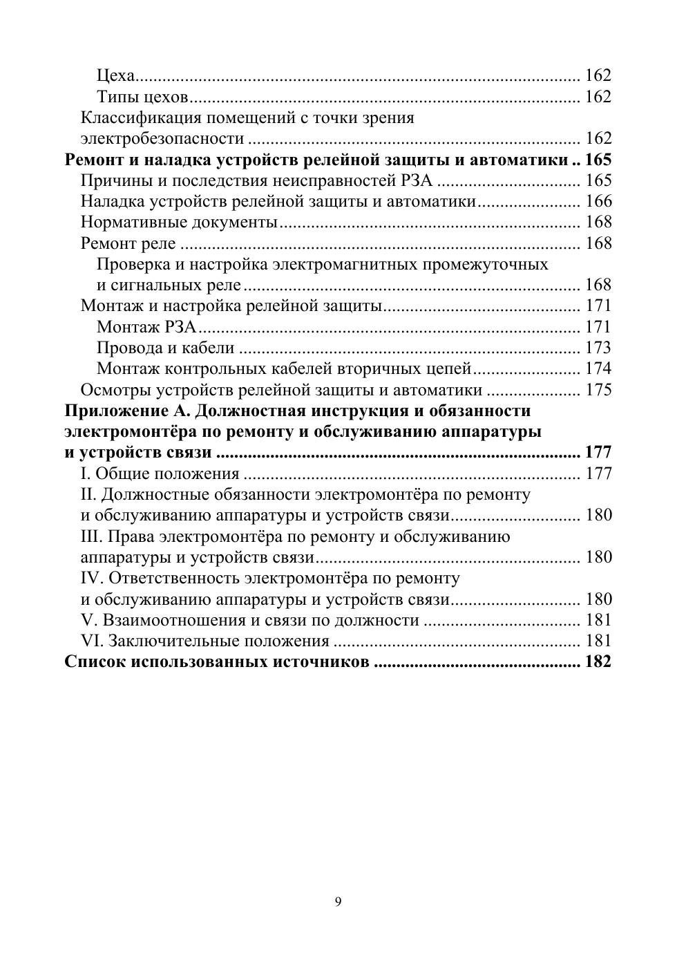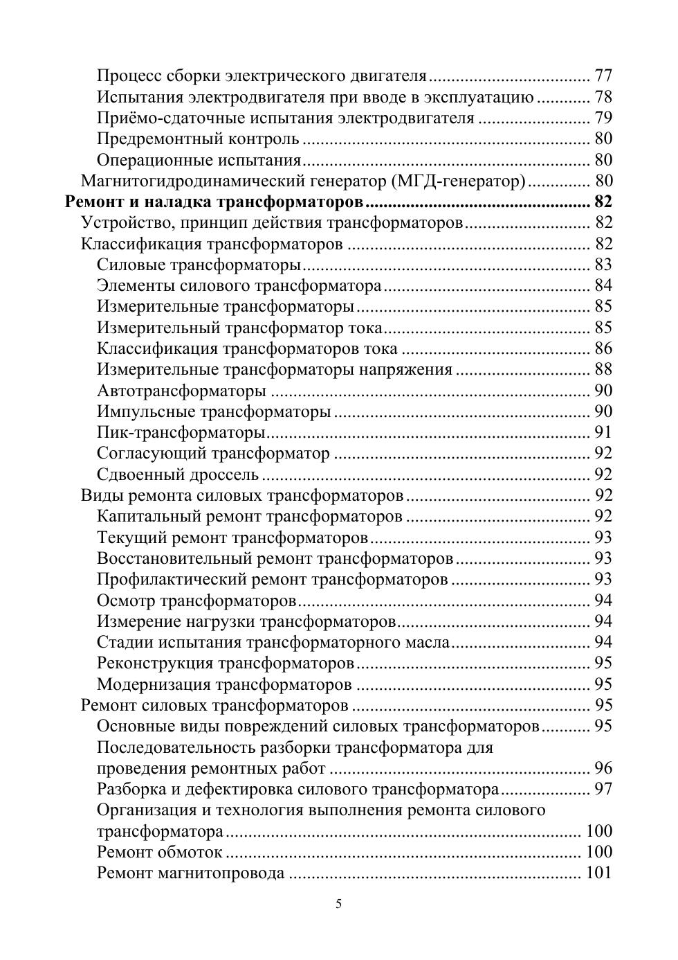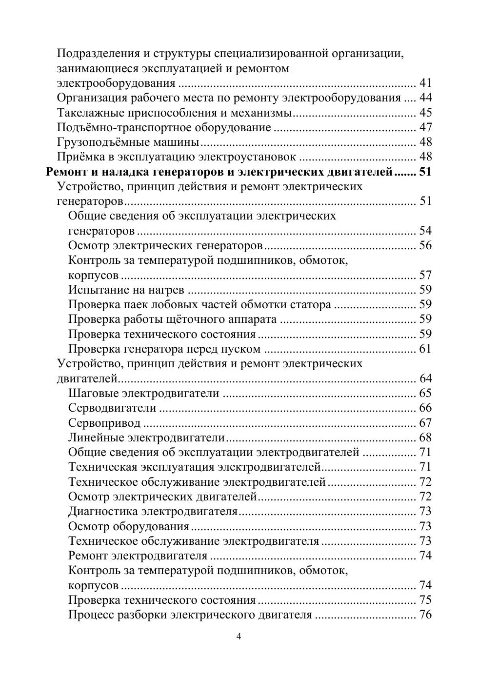 Рассматриваются: организация и планирование ремонта электрооборудования, ремонт и наладка электрических машин (генераторов, двигателей, трансформаторов), эксплуатация трансформаторных подстанций и распределительных устройств, эксплуатация и ремонт пускозащитной аппаратуры, осмотр и ремонт грузоподъёмной техники и станков, ремонт и наладка устройств релейной защиты, эксплуатация электрических сетей и осветительных установок.