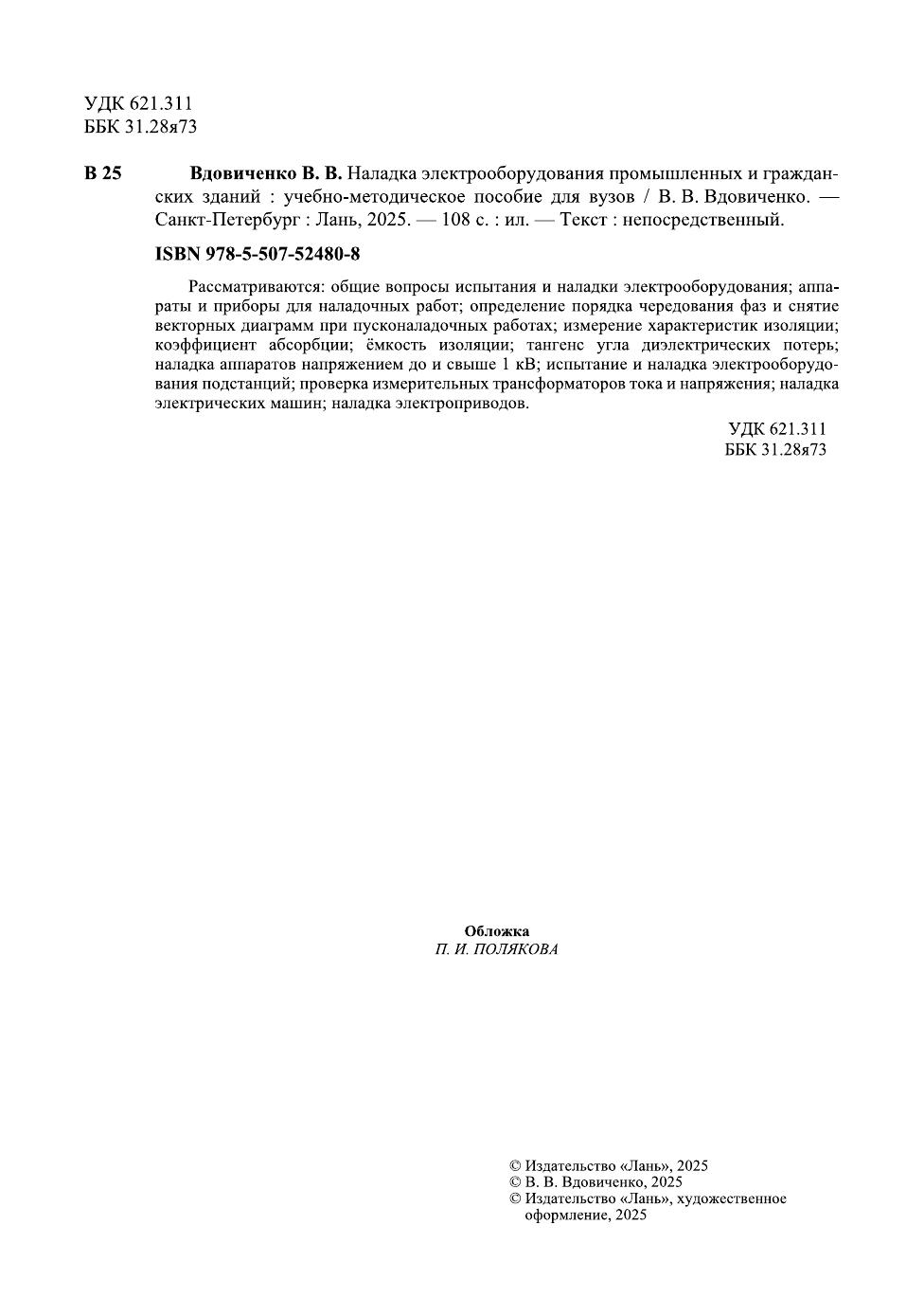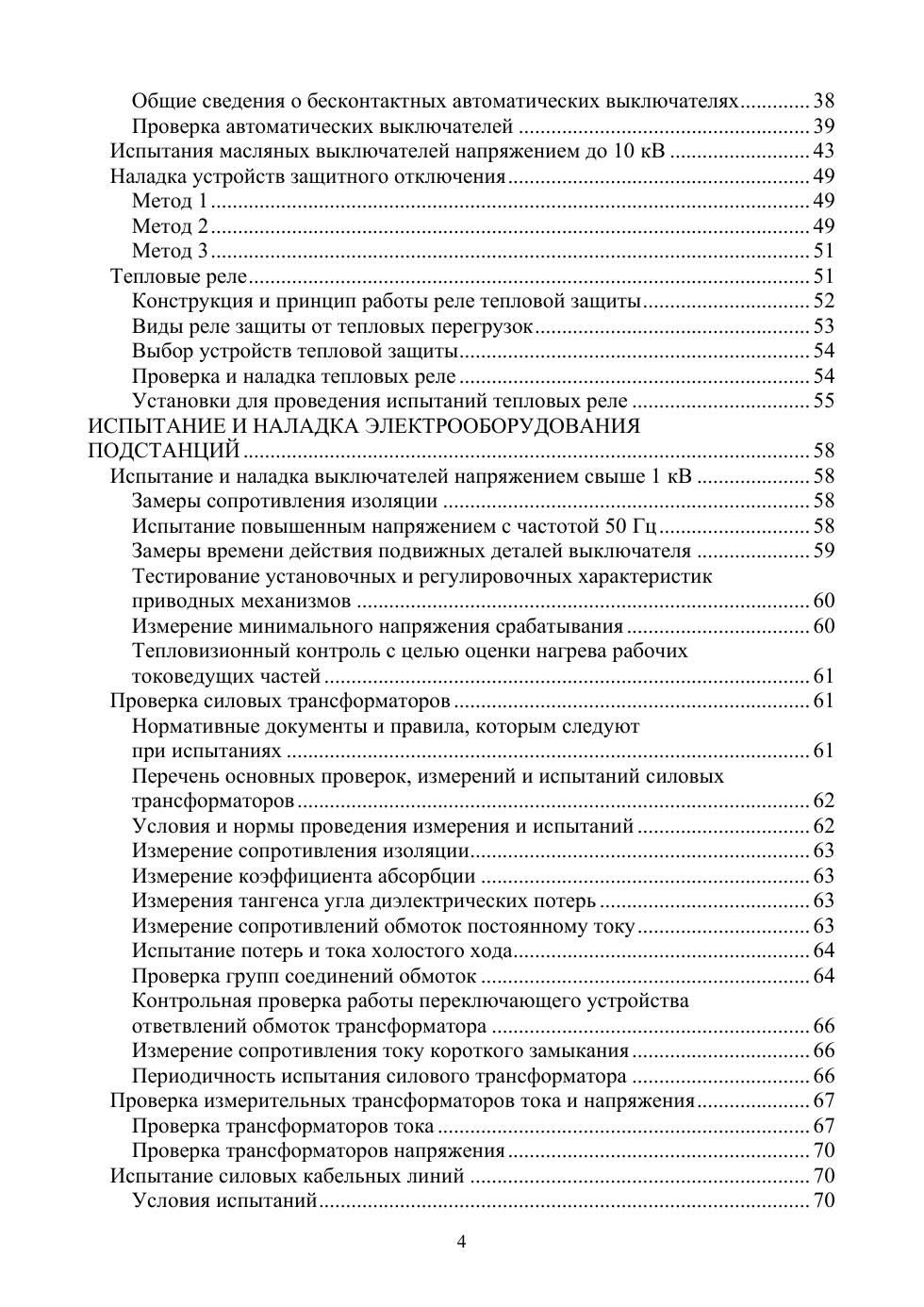 Рассматриваются: общие вопросы испытания и наладки электрооборудования, аппараты и приборы для наладочных работ, определение порядка чередования фаз и снятие векторных диаграмм при пусконаладочных работах, измерение характеристик изоляции, коэффициент абсорбции, ёмкость изоляции, тангенс угла диэлектрических потерь, наладка аппаратов напряжением до и свыше 1 кВ, испытание и наладка электрооборудования подстанций, проверка измерительных трансформаторов тока и напряжения, наладка электрических машин, наладка электроприводов.