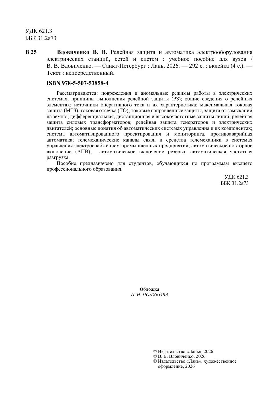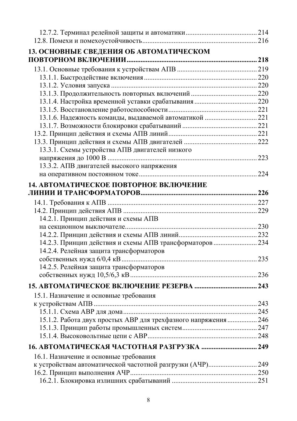 Рассматриваются: повреждения и аномальные режимы работы в электрических системах, принципы выполнения релейной защиты (РЗ), общие сведения о релейных элементах, источники оперативного тока и их характеристика, максимальная токовая защита (МТЗ), токовая отсечка (ТО), токовые направленные защиты, защита от замыканий на землю, дифференциальная, дистанционная и высокочастотные защиты линий, релейная защита силовых трансформаторов, релейная защита генераторов и электрических двигателей, основные понятия об автоматических системах управления и их компонентах, система автоматизированного проектирования и мониторинга, противоаварийная автоматика, телемеханические каналы связи и средства телемеханики в системах управления электроснабжением промышленных предприятий, автоматическое повторное включение (АПВ), автоматическое включение резерва, автоматическая частотная разгрузка. Пособие предназначено для студентов, обучающихся по программам высшего профессионального образования.