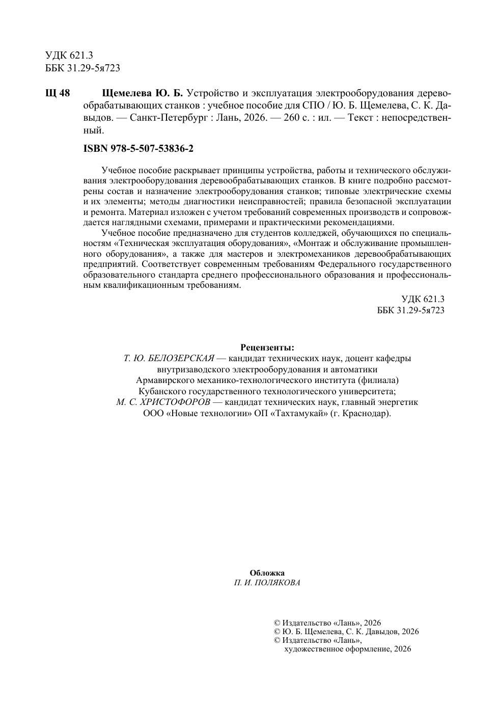 Учебное пособие раскрывает принципы устройства, работы и технического обслуживания электрооборудования деревообрабатывающих станков. В книге подробно рассмотрены состав и назначение электрооборудования станков, типовые электрические схемы и их элементы, методы диагностики неисправностей, правила безопасной эксплуатации и ремонта. Материал изложен с учетом требований современных производств и сопровождается наглядными схемами, примерами и практическими рекомендациями. Учебное пособие предназначено для студентов колледжей, обучающихся по специальностям «Техническая эксплуатация оборудования», «Монтаж и обслуживание промышленного оборудования», а также для мастеров и электромехаников деревообрабатывающих предприятий. Соответствует современным требованиям Федерального государственного образовательного стандарта среднего профессионального образования и профессиональным квалификационным требованиям.