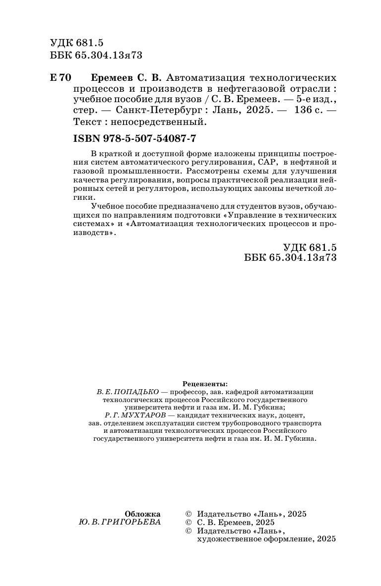 В краткой и доступной форме изложены принципы построения систем автоматического регулирования, САР, в нефтяной и газовой промышленности. Рассмотрены схемы для улучшения качества регулирования, вопросы практической реализации нейронных сетей и регуляторов, использующих законы нечеткой логики. Учебное пособие предназначено для студентов вузов, обучающихся по направлениям подготовки «Управление в технических системах» и «Автоматизация технологических процессов и производств».