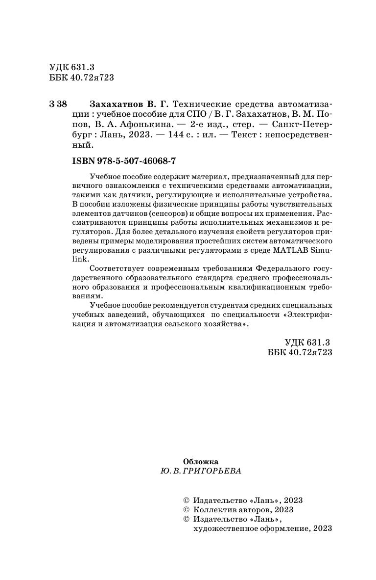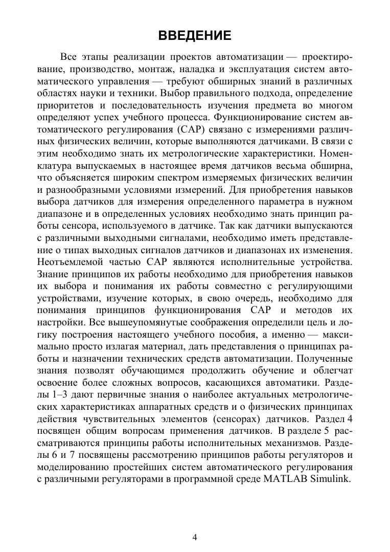 Учебное пособие содержит материал, предназначенный для первичного ознакомления с техническими средствами автоматизации, такими как датчики, регулирующие и исполнительные устройства. В пособии изложены физические принципы работы чувствительных элементов датчиков (сенсоров) и общие вопросы их применения. Рассматриваются принципы работы исполнительных механизмов и регуляторов. Для более детального изучения свойств регуляторов приведены примеры моделирования простейших систем автоматического регулирования с различными регуляторами в среде MATLAB Simulink. Соответствует современным требованиям Федерального государственного образовательного стандарта среднего профессионального образования и профессиональным квалификационным требованиям. Учебное пособие рекомендуется студентам средних специальных учебных заведений, обучающихся по специальности «Электрификация и автоматизация сельского хозяйства».