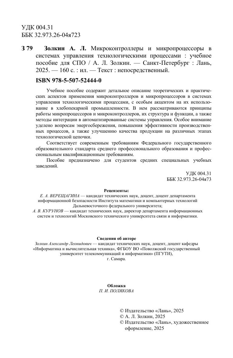 Учебное пособие содержит детальное описание теоретических и практических аспектов применения микроконтроллеров и микропроцессоров в системах управления технологическими процессами, с особым акцентом на их использование в хлебопекарной промышленности. В нем рассматриваются принципы работы микропроцессоров и микроконтроллеров, их структура и функции, а также методы интеграции в автоматизированные системы управления. Особое внимание уделено вопросам энергосбережения, повышения эффективности производственных процессов, а также улучшению качества продукции на различных этапах технологической цепочки. Соответствует современным требованиям Федерального государственного образовательного стандарта среднего профессионального образования и профес-сиональным квалификационным требованиям. Пособие предназначено для студентов средних специальных учебных заведений.