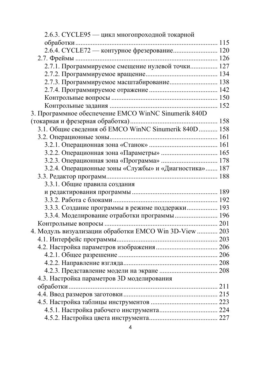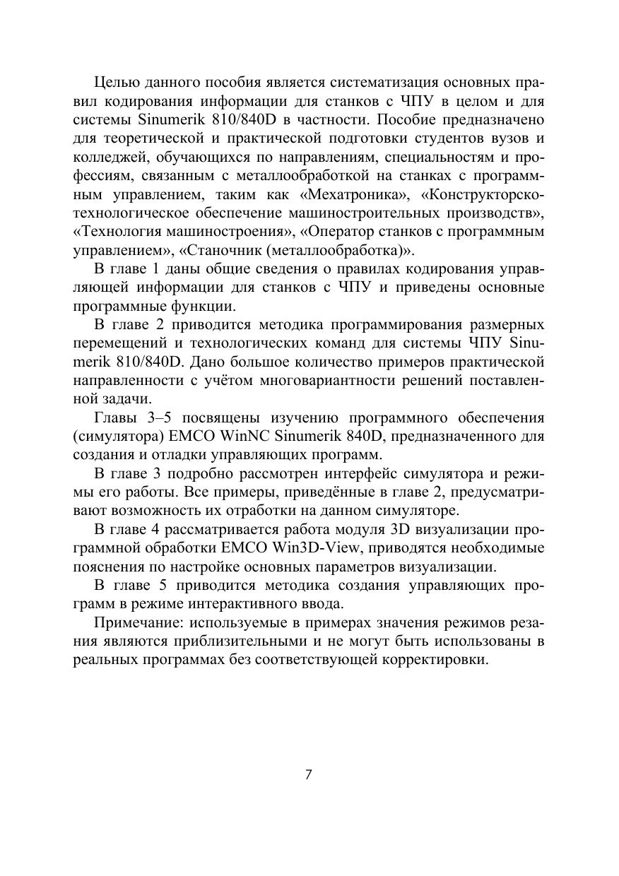 В учебном пособии приведены общие принципы разработки управляющих программ. Подробно рассмотрена методика программирования в системе ЧПУ Sinumerik 810/840D. Приведены примеры управляющих программ, в том числе с применением циклов точения, сверления и фрезерования. Рассмотрены принципы программирования и отладки управляющих программ на симуляторе программной обработки EMCO WinNC Sinumerik 840D. Пособие предназначено для студентов высших учебных заведений, обучающихся по направлениям «Конструкторско-технологическое обеспечение машиностроительных производств» и «Мехатроника и робототехника». Может использоваться на курсах операторов станков с ЧПУ.
