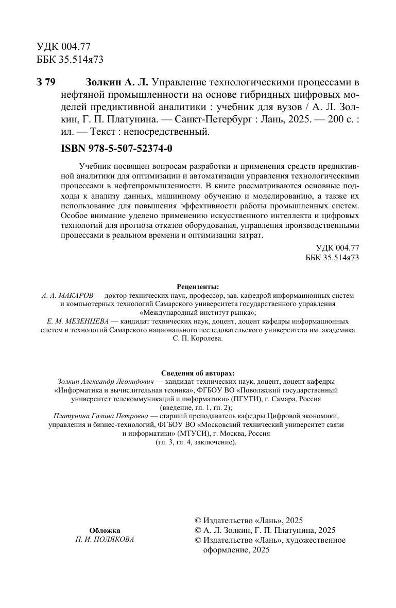 Учебник посвящен вопросам разработки и применения средств предиктивной аналитики для оптимизации и автоматизации управления технологическими процессами в нефтепромышленности. В книге рассматриваются основные подходы к анализу данных, машинному обучению и моделированию, а также их использование для повышения эффективности работы промышленных систем. Особое внимание уделено применению искусственного интеллекта и цифровых технологий для прогноза отказов оборудования, управления производственными процессами в реальном времени и оптимизации затрат.