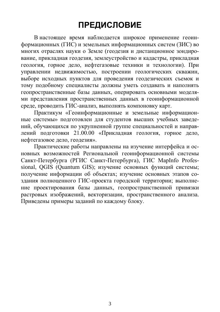 В пособии рассмотрены интерфейс и основные возможности Региональной геоинформационной системы Санкт-Петербурга, разобрано задание по подготовке схемы расположения границ земельного участка и формирования заключения кадастрового инженера с использованием данных РГИС. Рассмотрен интерфейс и основные возможности ГИС MapInfo Professional: основные элементы и инструменты пространственного анализа, основные этапы создания ГИС-проекта городской территории, а также приведены правила создания отчетов. Рассмотрен интерфейс и основные возможности ГИС QGIS (Quantum GIS): основные функции системы, основные этапы создания ГИС-проекта, инструменты пространственного анализа, приведены рекомендации по выполнению работ. Пособие предназначено для студентов вузов, обучающихся по укрупненной группе специальностей «Прикладная геология, горное дело, нефтегазовое дело, геодезия».