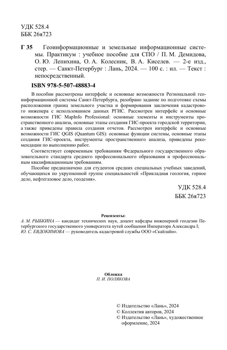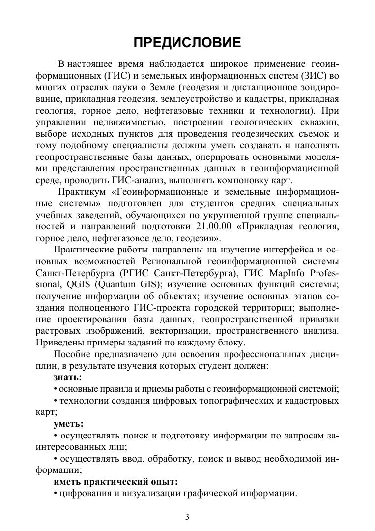 В пособии рассмотрены интерфейс и основные возможности Региональной геоинформационной системы Санкт-Петербурга, разобрано задание по подготовке схемы расположения границ земельного участка и формирования заключения кадастрового инженера с использованием данных РГИС. Рассмотрен интерфейс и основные возможности ГИС MapInfo Professional: основные элементы и инструменты пространственного анализа, основные этапы создания ГИС-проекта городской территории, а также приведены правила создания отчетов. Рассмотрен интерфейс и основные возможности ГИС QGIS (Quantum GIS): основные функции системы, основные этапы создания ГИС-проекта, инструменты пространственного анализа, приведены рекомендации по выполнению работ. Соответствует современным требованиям Федерального государственного образовательного стандарта среднего профессионального образования и профессиональным квалификационным требованиям. Пособие предназначено для студентов средних специальных учебных заведений, обучающихся по укрупненной группе специальностей «Прикладная геология, горное дело, нефтегазовое дело, геодезия».