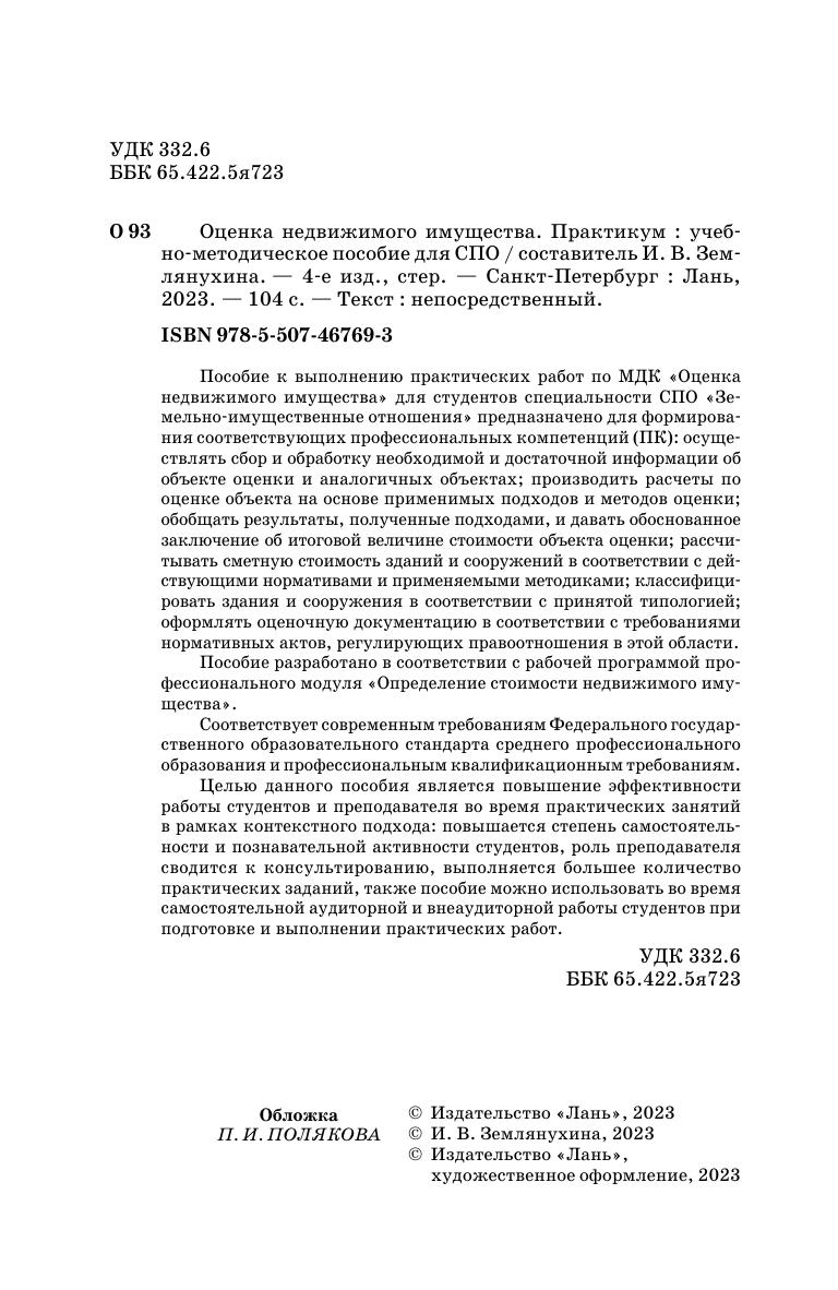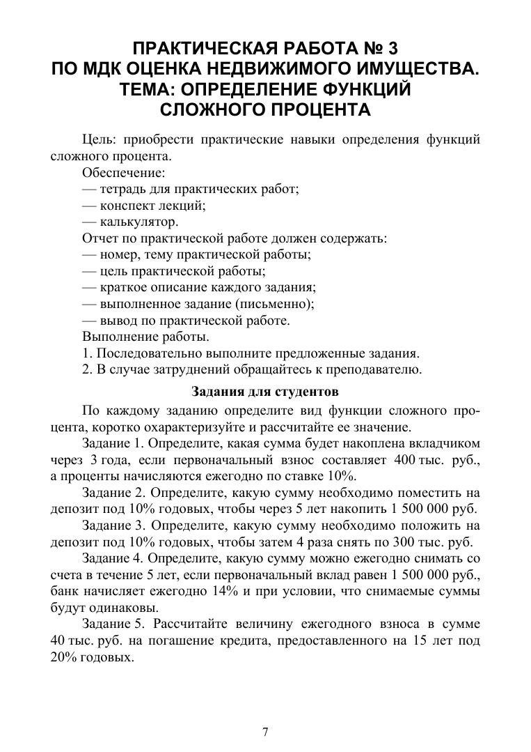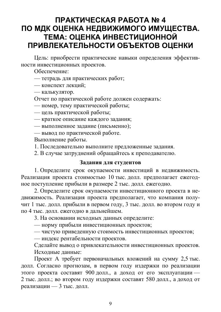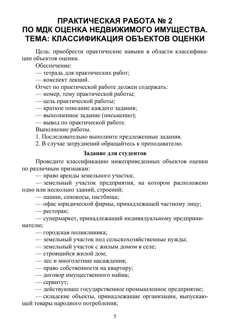 Пособие к выполнению практических работ по МДК «Оценка недвижимого имущества» для студентов специальности СПО «Земельно-имущественные отношения» предназначено для формирования соответствующих профессиональных компетенций (ПК): осуществлять сбор и обработку необходимой и достаточной информации об объекте оценки и аналогичных объектах, производить расчеты по оценке объекта на основе применимых подходов и методов оценки, обобщать результаты, полученные подходами, и давать обоснованное заключение об итоговой величине стоимости объекта оценки, рассчитывать сметную стоимость зданий и сооружений в соответствии с действующими нормативами и применяемыми методиками, классифицировать здания и сооружения в соответствии с принятой типологией, оформлять оценочную документацию в соответствии с требованиями нормативных актов, регулирующих правоотношения в этой области. Пособие разработано в соответствии с рабочей программой профессионального модуля «Определение стоимости недвижимого имущества». Соответствует современным требованиям Федерального государственного образовательного стандарта среднего профессионального образования и профессиональным квалификационным требованиям. Целью данного пособия является повышение эффективности работы студентов и преподавателя во время практических занятий в рамках контекстного подхода: повышается степень самостоятельности и познавательной активности студентов, роль преподавателя сводится к консультированию, выполняется большее количество практических заданий, также пособие можно использовать во время самостоятельной аудиторной и внеаудиторной работы студентов при подготовке и выполнении практических работ.