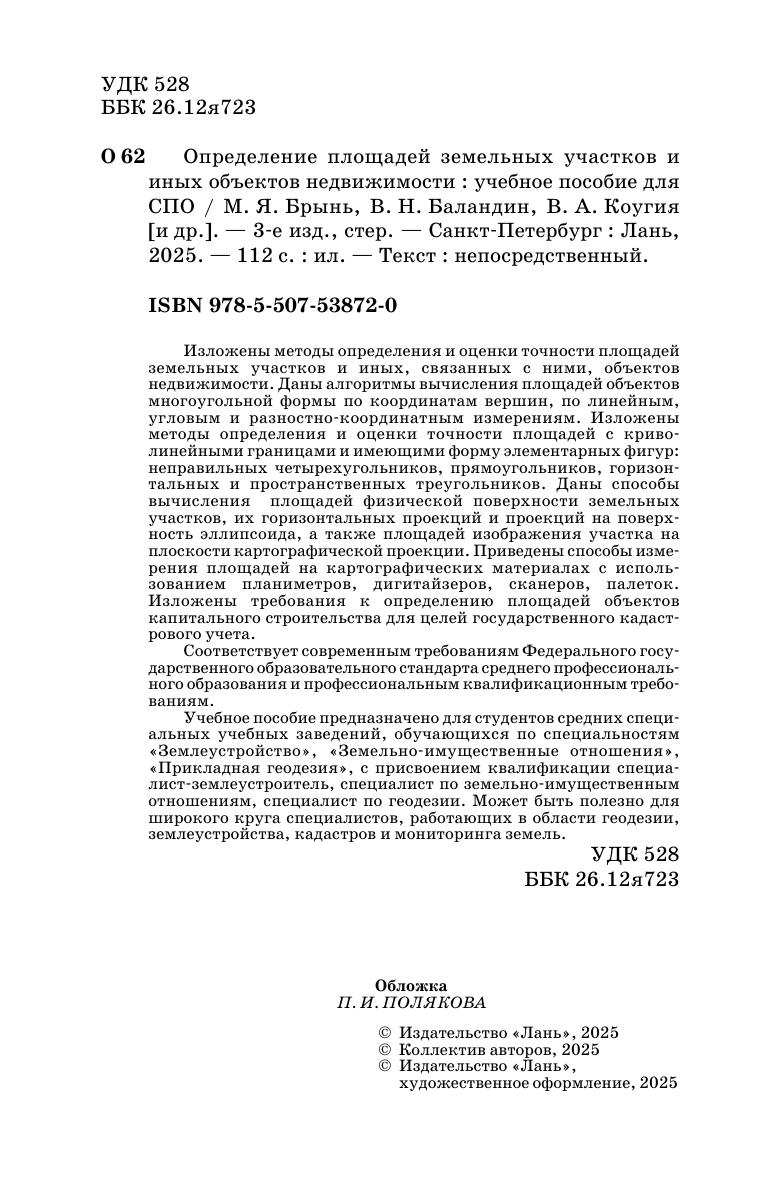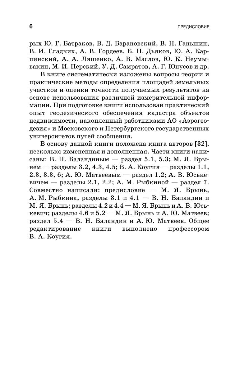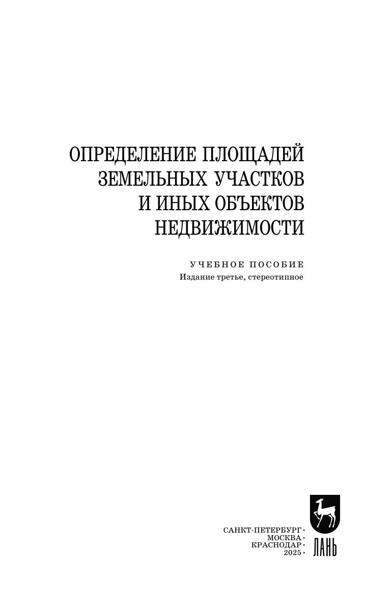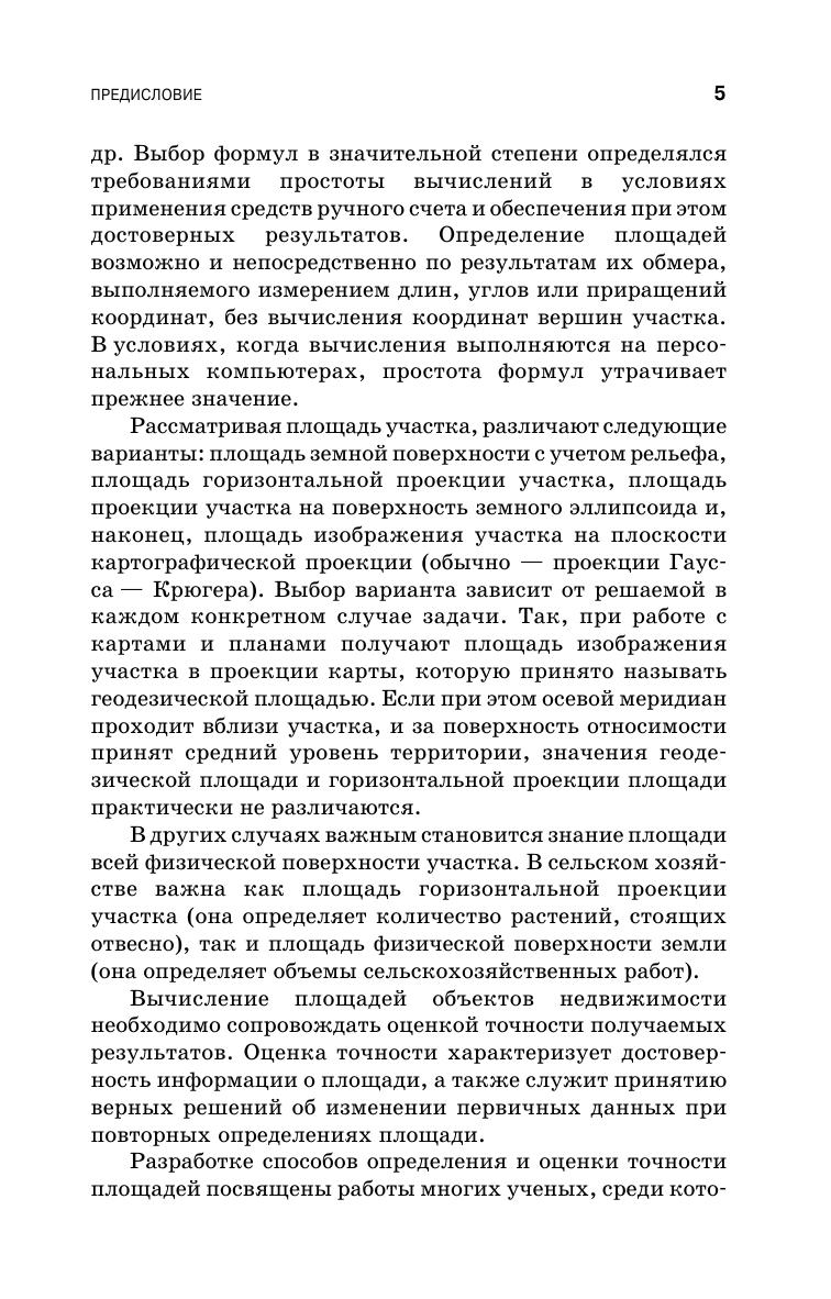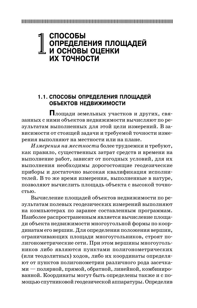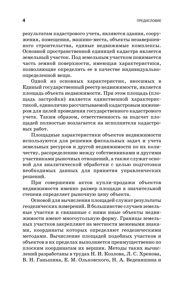 Изложены методы определения и оценки точности площадей земельных участков и иных, связанных с ними, объектов недвижимости. Даны алгоритмы вычисления площадей объектов многоугольной формы по координатам вершин, по линейным, угловым и разностно-координатным измерениям. Изложены методы определения и оценки точности площадей с криволинейными границами и имеющими форму элементарных фигур: неправильных четырехугольников, прямоугольников, горизонтальных и пространственных треугольников. Даны способы вычисления площадей физической поверхности земельных участков, их горизонтальных проекций и проекций на поверхность эллипсоида, а также площадей изображения участка на плоскости картографической проекции. Приведены способы измерения площадей на картографических материалах с использованием планиметров, дигитайзеров, сканеров, палеток. Изложены требования к определению площадей объектов капитального строительства для целей государственного кадастрового учета. Соответствует современным требованиям Федерального государственного образовательного стандарта среднего профессионального образования и профессиональным квалификационным требованиям. Учебное пособие предназначено для студентов средних специальных учебных заведений, обучающихся по специальностям «Землеустройство», «Земельно-имущественные отношения», «Прикладная геодезия», с присвоением квалификации специалист-землеустроитель, специалист по земельно-имущественным отношениям, специалист по геодезии. Может быть полезно для широкого круга специалистов, работающих в области геодезии, землеустройства, кадастров и мониторинга земель.
