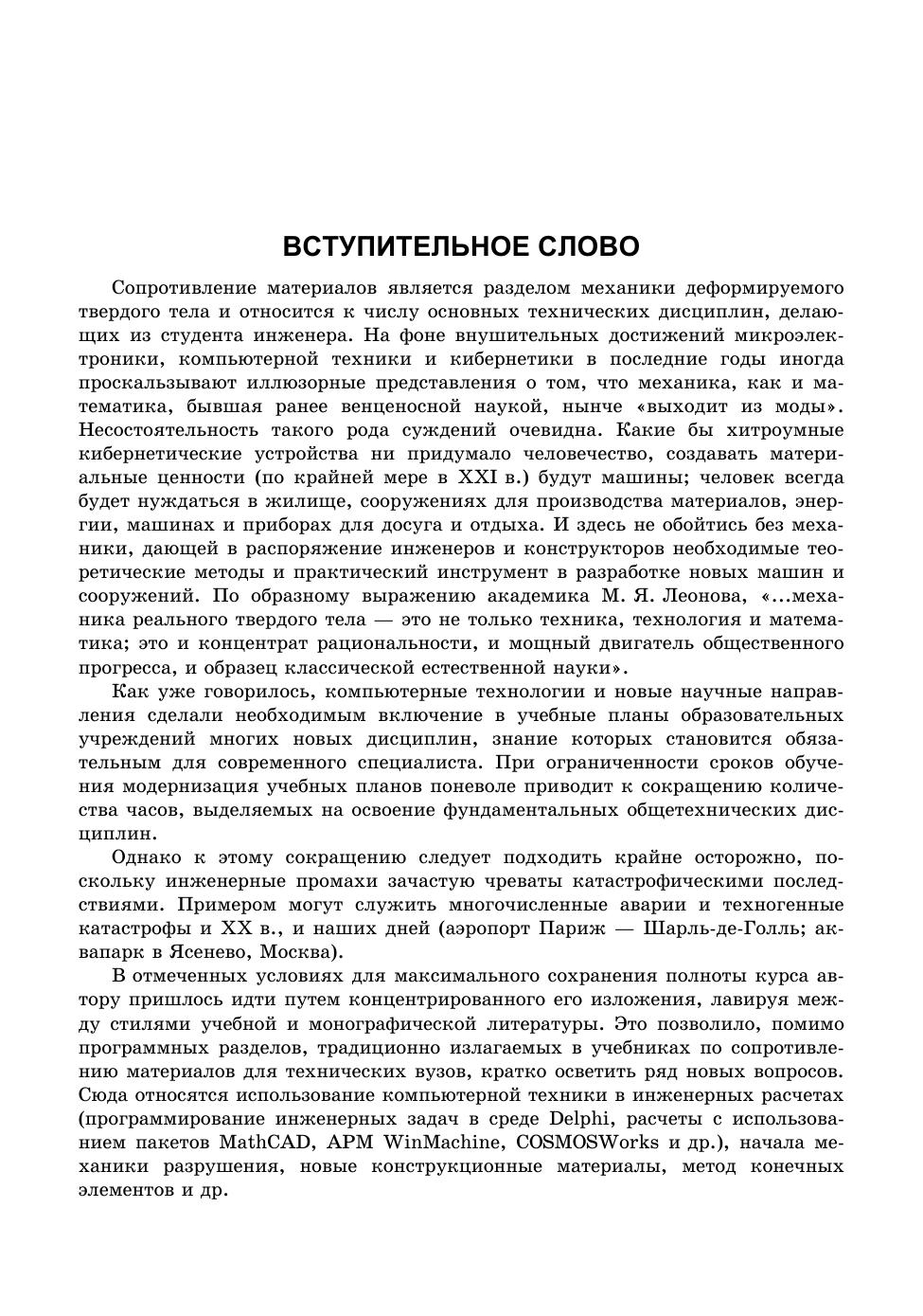 В доступной форме изложены основы сопротивления материалов. Рассмотрение теоретических положений сопровождается пояснениями и примерами. Дано подробное решение типовых задач с рекомендациями методического характера. По каждой теме даны вопросы для самопроверки усвоения материала. Даны основы механики разрушения, вариационные принципы механики деформируемого твердого тела и введение в метод конечных элементов. Книга может быть использована в программах подготовки магистров и научно-исследовательской работе студентов. Приведены примеры использования компьютерных приложений в инженерных расчетах (Delphi, APM WinMashine, COSMOSWorks и др.). Малый объем этого материала отражает авторский взгляд на подобные приложения как на весьма полезный инструмент, который, однако, не может заменить фундаментальных теоретических знаний механики. Пособие предназначено для студентов и аспирантов инженерных и инженерно-технологических факультетов высших учебных заведений.