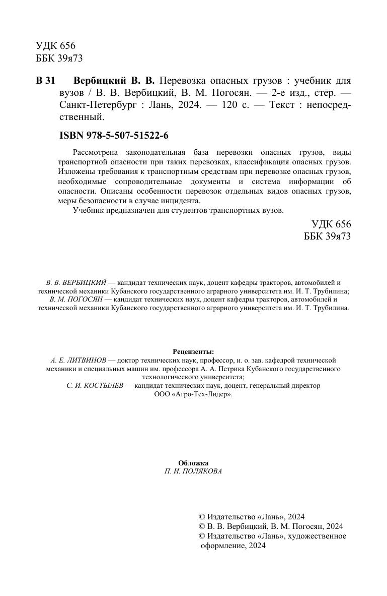 Рассмотрена законодательная база перевозки опасных грузов, виды транспортной опасности при таких перевозках, классификация опасных грузов. Изложены требования к транспортным средствам при перевозке опасных грузов, необходимые сопроводительные документы и система информации об опасности. Описаны особенности перевозок отдельных видов опасных грузов, меры безопасности в случае инцидента. Учебник предназначен для студентов транспортных вузов.
