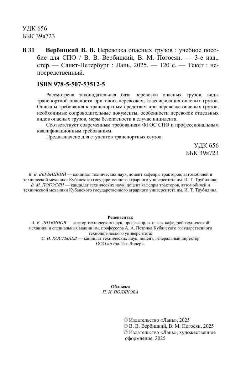Рассмотрена законодательная база перевозки опасных грузов, виды транспортной опасности при таких перевозках, классификация опасных грузов. Описаны требования к транспортным средствам при перевозке опасных грузов, необходимые сопроводительные документы, особенности перевозок отдельных видов опасных грузов, меры безопасности в случае инцидента. Соответствует современным требованиям ФГОС СПО и профессиональным квалификационным требованиям. Предназначено для студентов транспортных ссузов.