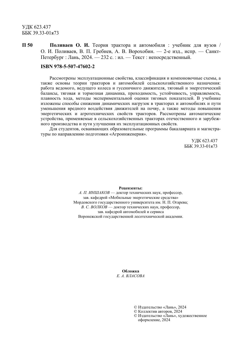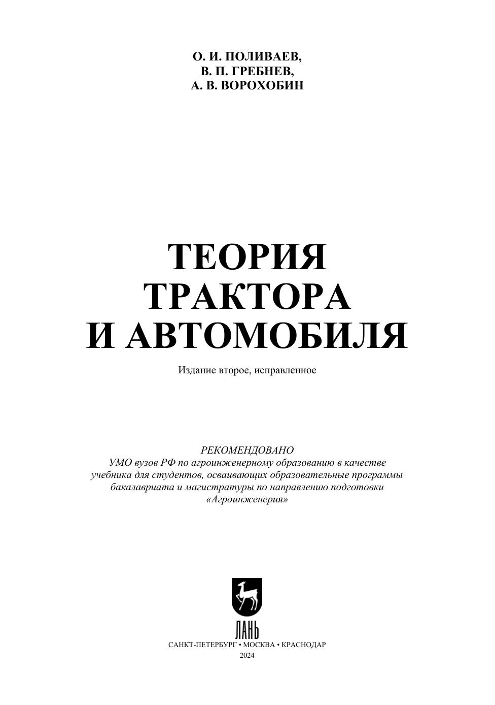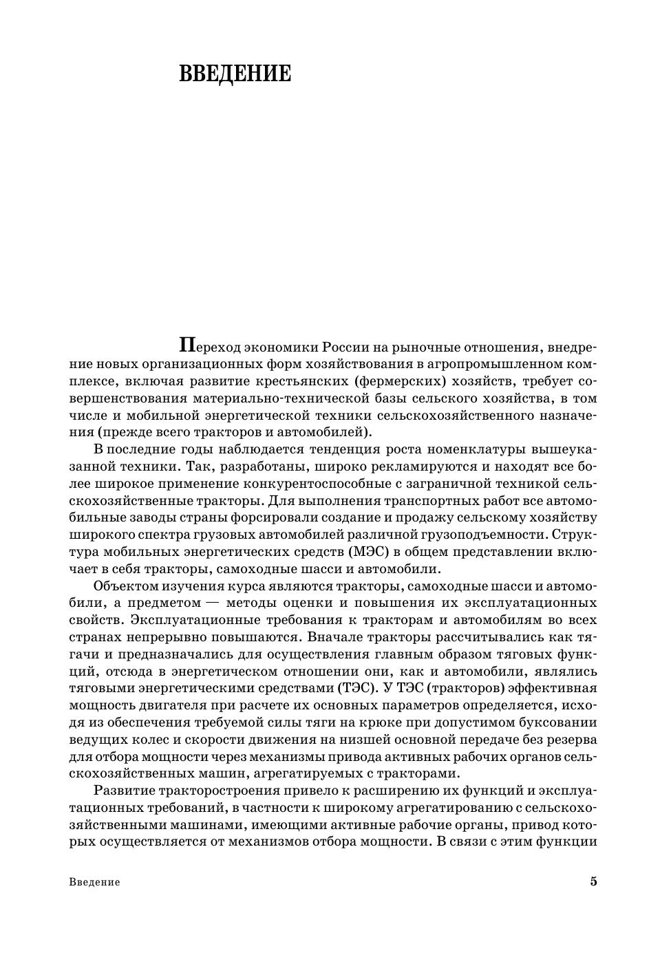 Рассмотрены эксплуатационные свойства, классификация и компоновочные схемы, а также основы теории тракторов и автомобилей сельскохозяйственного назначения: работа ведомого, ведущего колеса и гусеничного движителя, тяговый и энергетический балансы, тяговая и тормозная динамика, проходимость, устойчивость, управляемость, плавность хода, методы экспериментальной оценки тяговых показателей. В учебнике изложены способы снижения динамических нагрузок в тракторах и автомобилях и пути уменьшения вредного воздействия движителей на почву, а также методы повышения энергетических и агротехнических свойств тракторов. Рассмотрены автоматические устройства, применяемые в сельскохозяйственных тракторах отечественного и зарубежного производства и пути улучшения их эксплуатационных свойств. Для студентов, осваивающих образовательные программы бакалавриата и магистратуры по направлению подготовки "Агроинженерия".