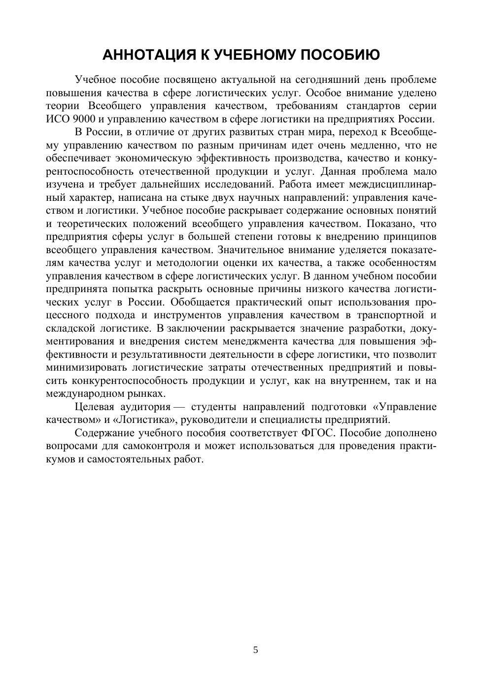 Учебное пособие посвящено актуальной на сегодняшний день теме повышения качества и эффективности бизнеса в сфере услуг и логистики. В нем раскрывается содержание основных понятий, теоретических концепций и принципов управления качеством. Особое внимание уделено парадигме «Всеобщего управления качеством» и требованиям серии международных стандартов ИСО 9000. В пособии даны результаты собственного исследования по проблемам низкого качества логистических услуг в России и предпринята попытка раскрыть основные причины. Приведен анализ взглядов других исследователей и показано, что предприятия сферы услуг уже в значительной степени готовы к внедрению новой модели менеджмента — модели всеобщего управления качеством. Соответствует современным требованиям Федерального государственного образова-тельного стандарта среднего профессионального образования и профессиональным квалификационным требованиям. Целевая аудитория пособия — студенты профессиональных образовательных организаций экономических направлений подготовки, а также руководители и специалисты предприятий сферы услуг.