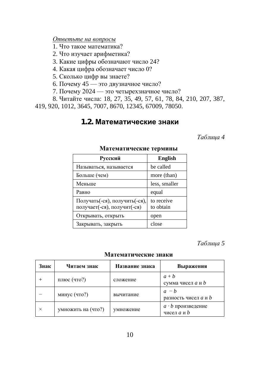 Учебное пособие предназначено для иностранных студентов, которые обучаются на подготовительных факультетах университетов РФ. В пособии изложены основные разделы курса элементарной математики, что полностью соответствует рабочей программе по математике для подготовительных факультетов высших учебных заведений. Пособие содержит тексты, лексико-грамматический материал, вопросы и упражнения, а также графический материал, позволяющий слушателям-иностранцам освоить основы элементарной математики. В пособии представлены примеры, задачи, графики, которые помогут формировать собственные устные или письменные высказывания учащегося. Пособие может быть использовано при обучении студентов подготовительных факультетов, имеющих начальную языковую подготовку, а также студентами первого курса для повторения лексического материала и обобщения знаний по элементарной математике и началам анализа.