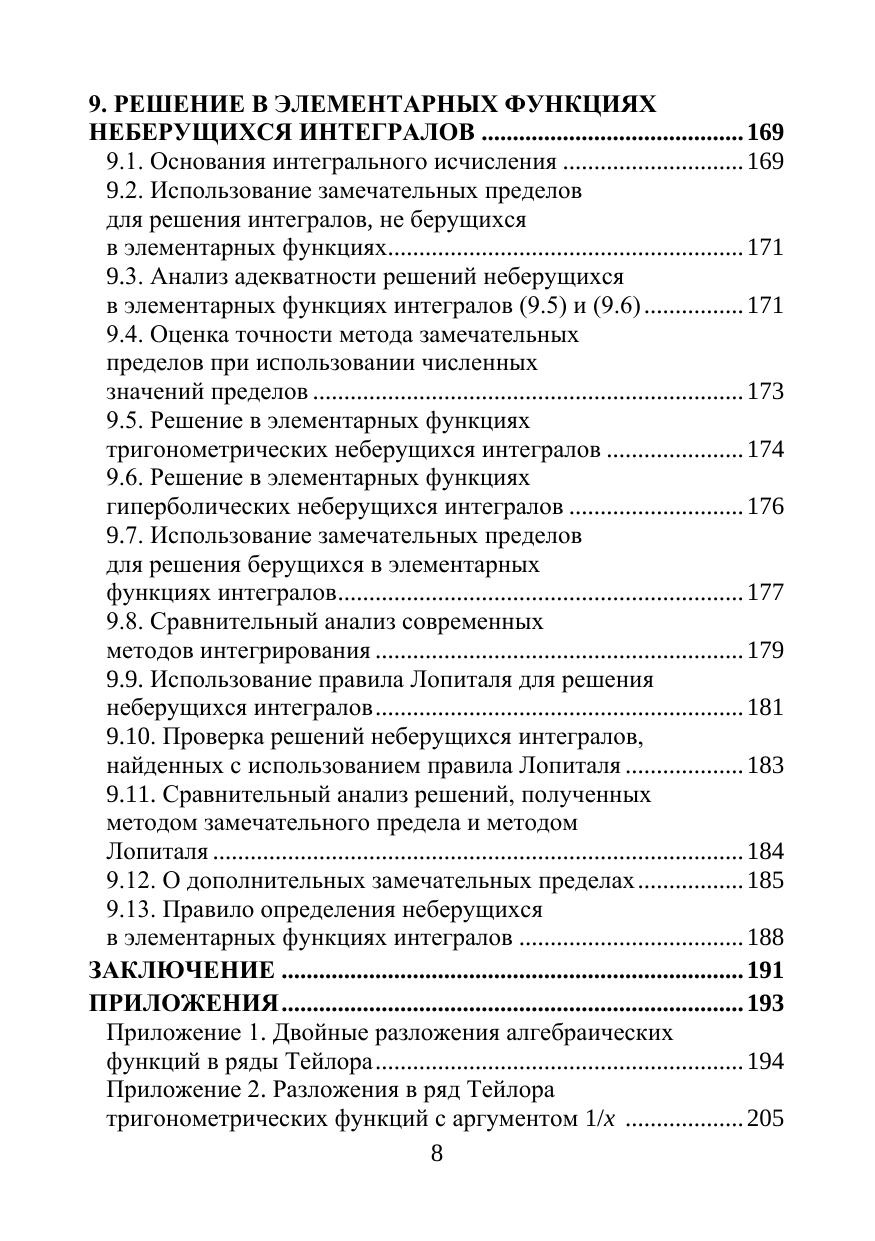 В книге представлен новый метод интегрирования в элементарных функциях на основе использования замечательных пределов. Показаны решения порядка четырех сотен тригонометрических, гиперболических и логарифмических интегралов.