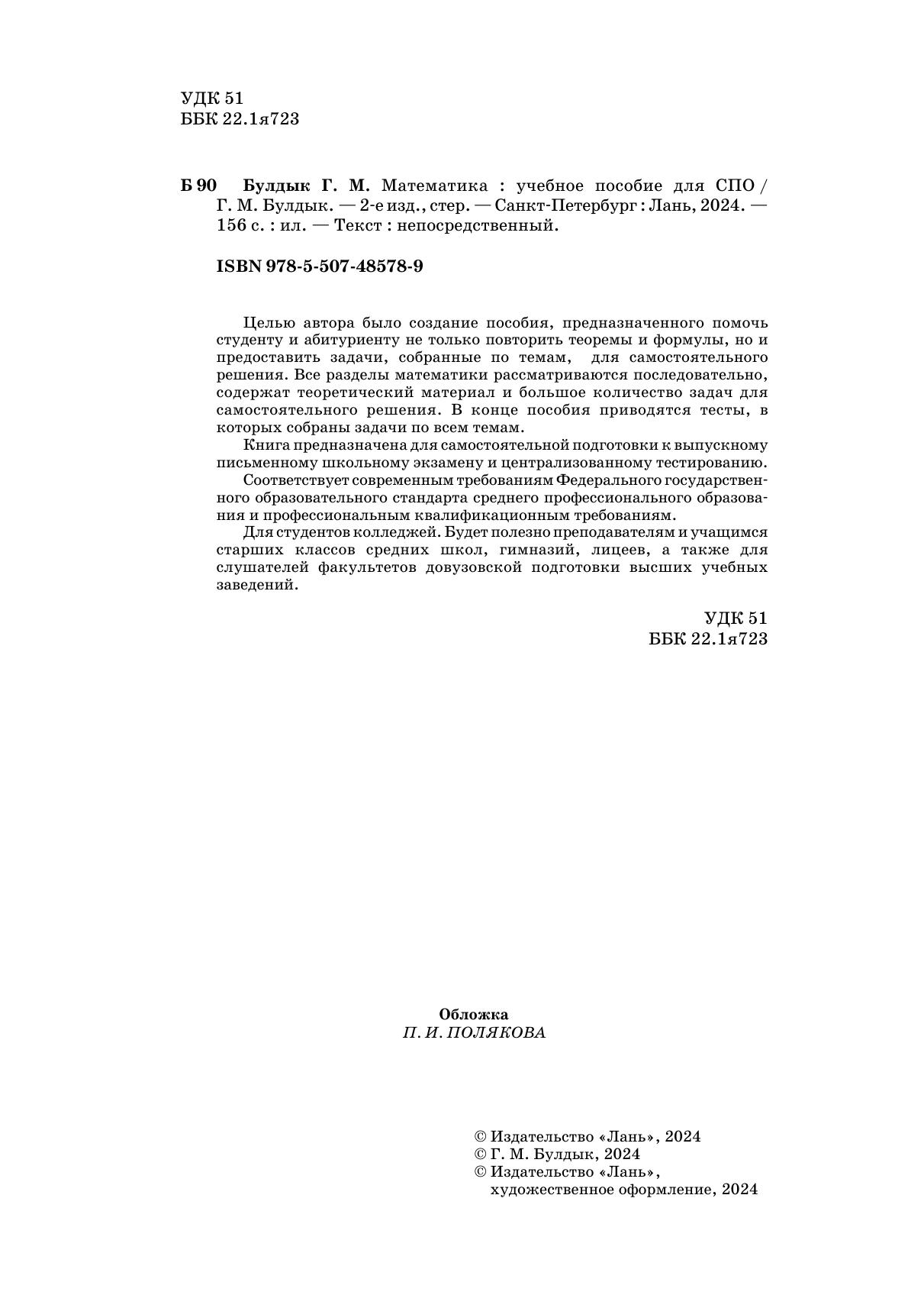 Целью автора было создание пособия, предназначенного помочь студенту и абитуриенту не только повторить теоремы и формулы, но и предоставить задачи, собранные по темам, для самостоятельного решения. Все разделы математики рассматриваются последовательно, содержат теоретический материал и большое количество задач для самостоятельного решения. В конце пособия приводятся тесты, в которых собраны задачи по всем темам. Книга предназначена для самостоятельной подготовки к выпускному письменному школьному экзамену и централизованному тестированию. Соответствует современным требованиям Федерального государственного образовательного стандарта среднего профессионального образования и профессиональным квалификационным требованиям. Для студентов колледжей. Будет полезно преподавателям и учащимся старших классов средних школ, гимназий, лицеев, а также для слушателей факультетов довузовской подготовки высших учебных заведений.