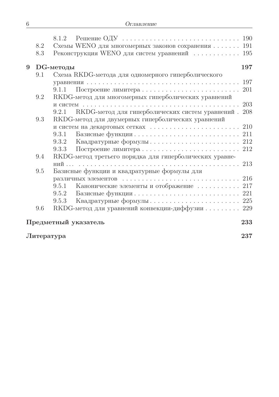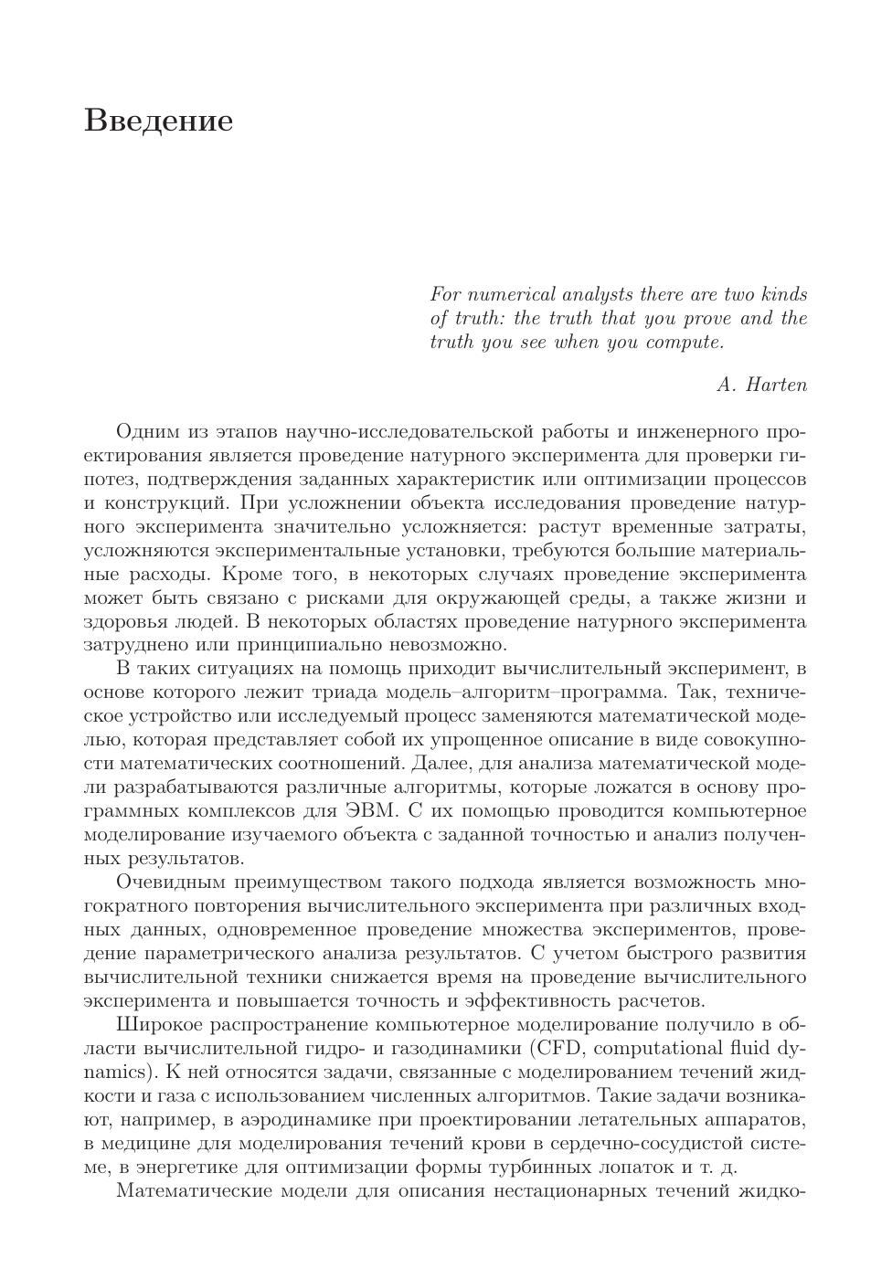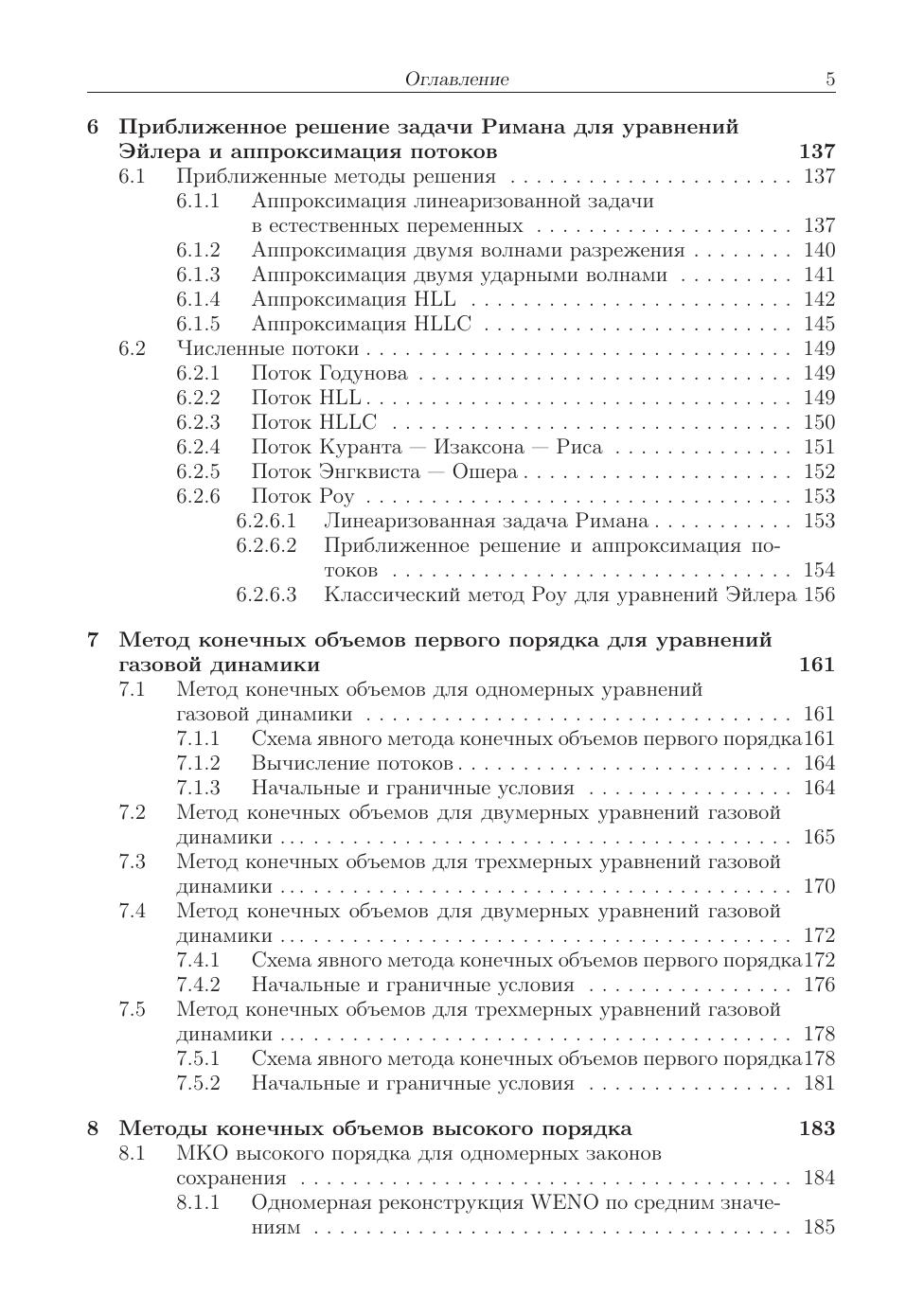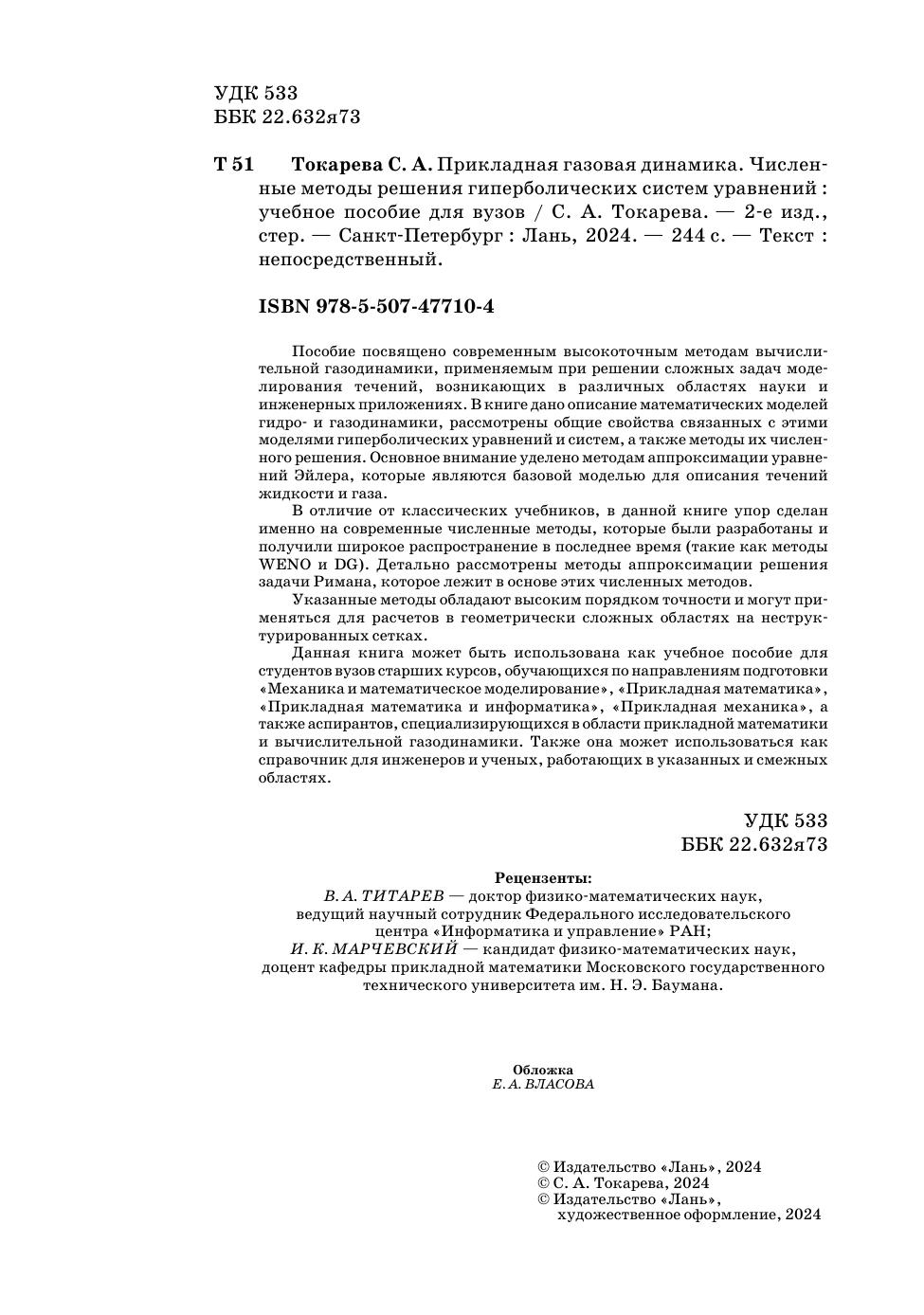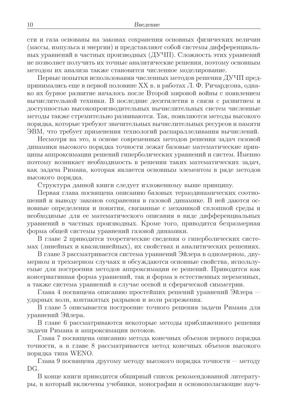 Пособие посвящено современным высокоточным методам вычислительной газодинамики, применяемым при решении сложных задач моделирования течений, возникающих в различных областях науки и инженерных приложениях. В книге дано описание математических моделей гидро- и газодинамики, рассмотрены общие свойства связанных с этими моделями гиперболических уравнений и систем, а также методы их численного решения. Основное внимание уделено методам аппроксимации уравнений Эйлера, которые являются базовой моделью для описания течений жидкости и газа. В отличие от классических учебников, в данной книге упор сделан именно на современные численные методы, которые были разработаны и получили широкое распространение в последнее время (такие как методы WENO и DG). Детально рассмотрены методы аппроксимации решения задачи Римана, которое лежит в основе этих численных методов. Указанные методы обладают высоким порядком точности и могут применяться для расчетов в геометрически сложных областях на неструктурированных сетках. Данная книга может быть использована как учебное пособие для студентов вузов старших курсов, обучающихся по направлениям подготовки «Механика и математическое моделирование», «Прикладная математика», «Прикладная математика и информатика», «Прикладная механика», а также аспирантов, специализирующихся в области прикладной математики и вычислительной газодинамики. Также она может использоваться как справочник для инженеров и ученых, работающих в указанных и смежных областях.