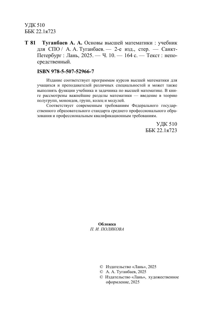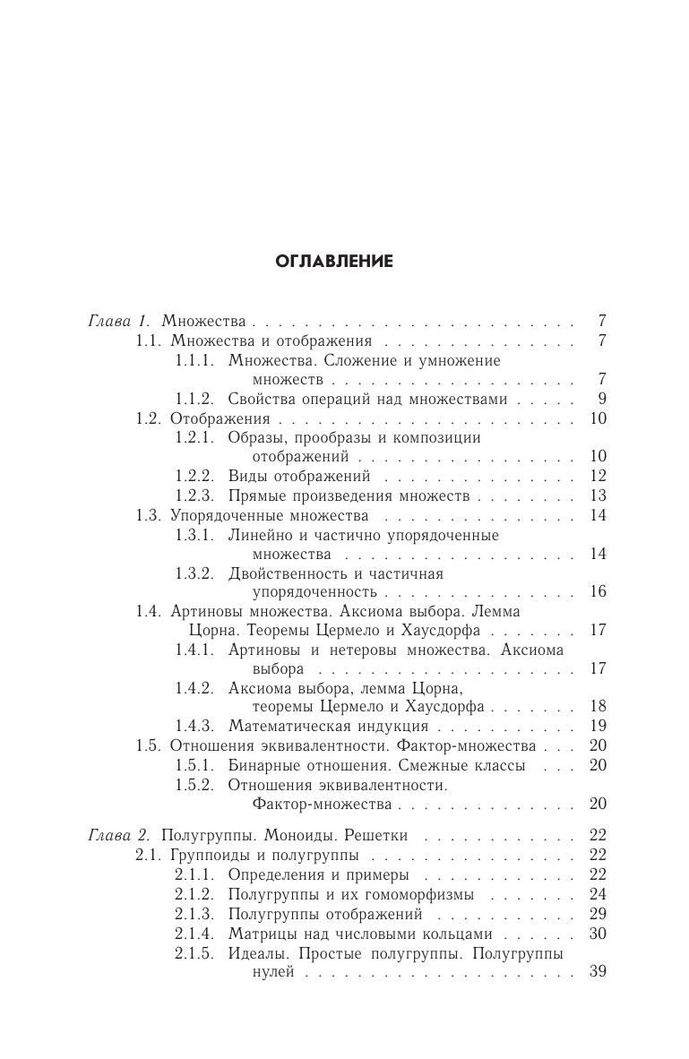 Издание соответствует программам курсов высшей математики для учащихся и преподавателей различных специальностей и может также выполнять функции учебника и задачника по высшей математике. В книге рассмотрены важнейшие разделы математики — введение в теорию полугрупп, моноидов, групп, колец и модулей. Соответствует современным требованиям Федерального государственного образовательного стандарта среднего профессионального образования и профессиональным квалификационным требованиям.