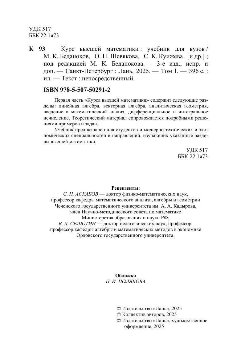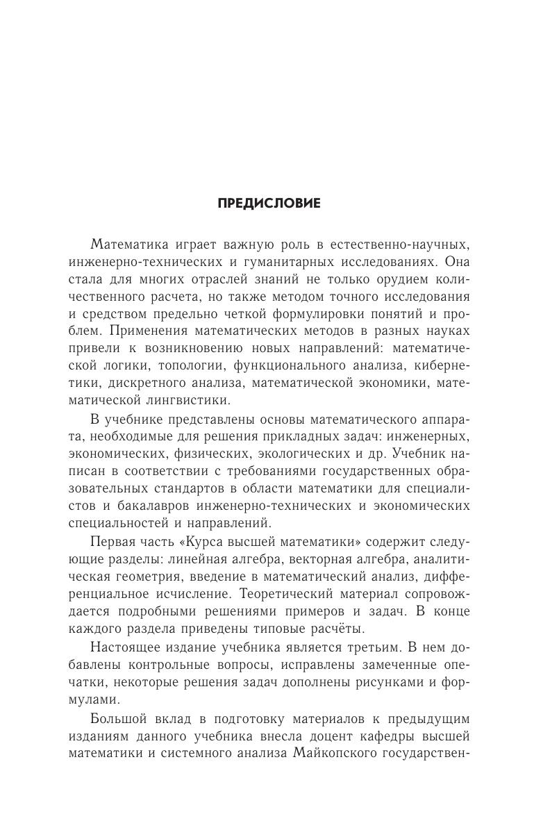 Первая часть «Курса высшей математики» содержит следующие разделы: линейная алгебра, векторная алгебра, аналитическая геометрия, введение в математический анализ, дифференциальное и интегральное исчисление. Теоретический материал сопровождается подробными решениями примеров и задач. Учебник предназначен для студентов инженерно-технических и экономических специальностей и направлений, изучающих указанные разделы высшей математики.