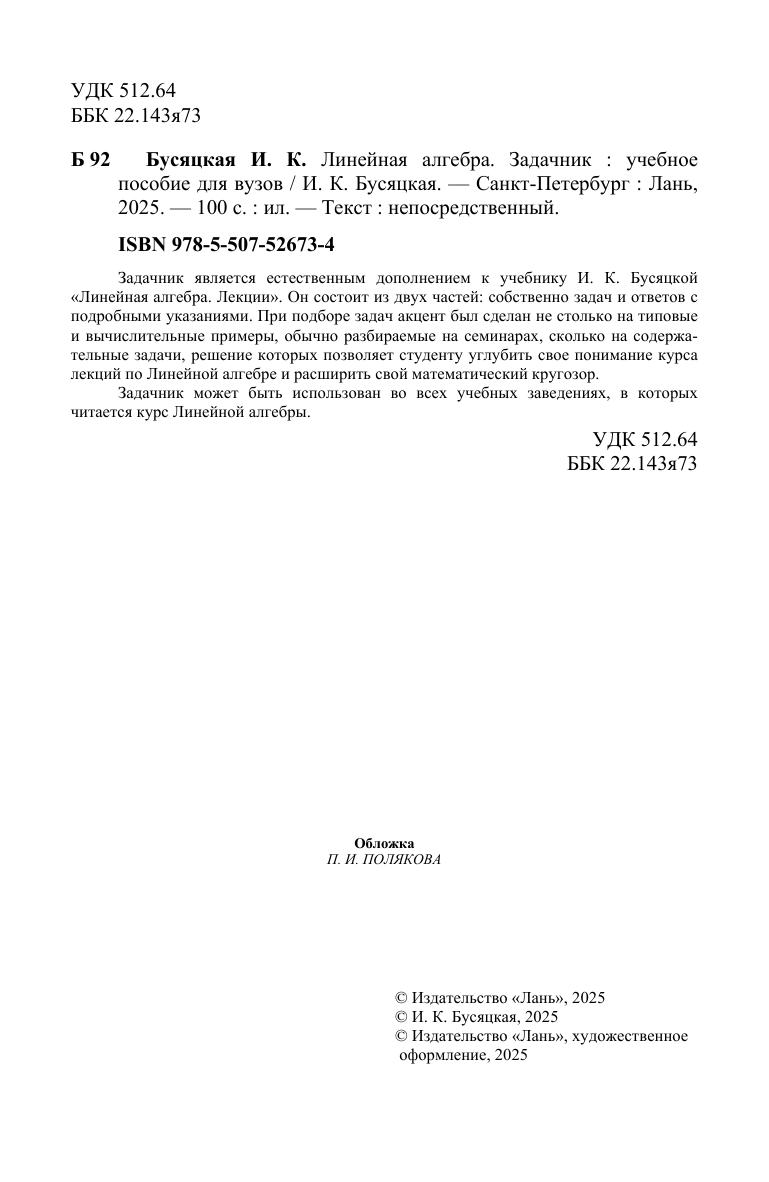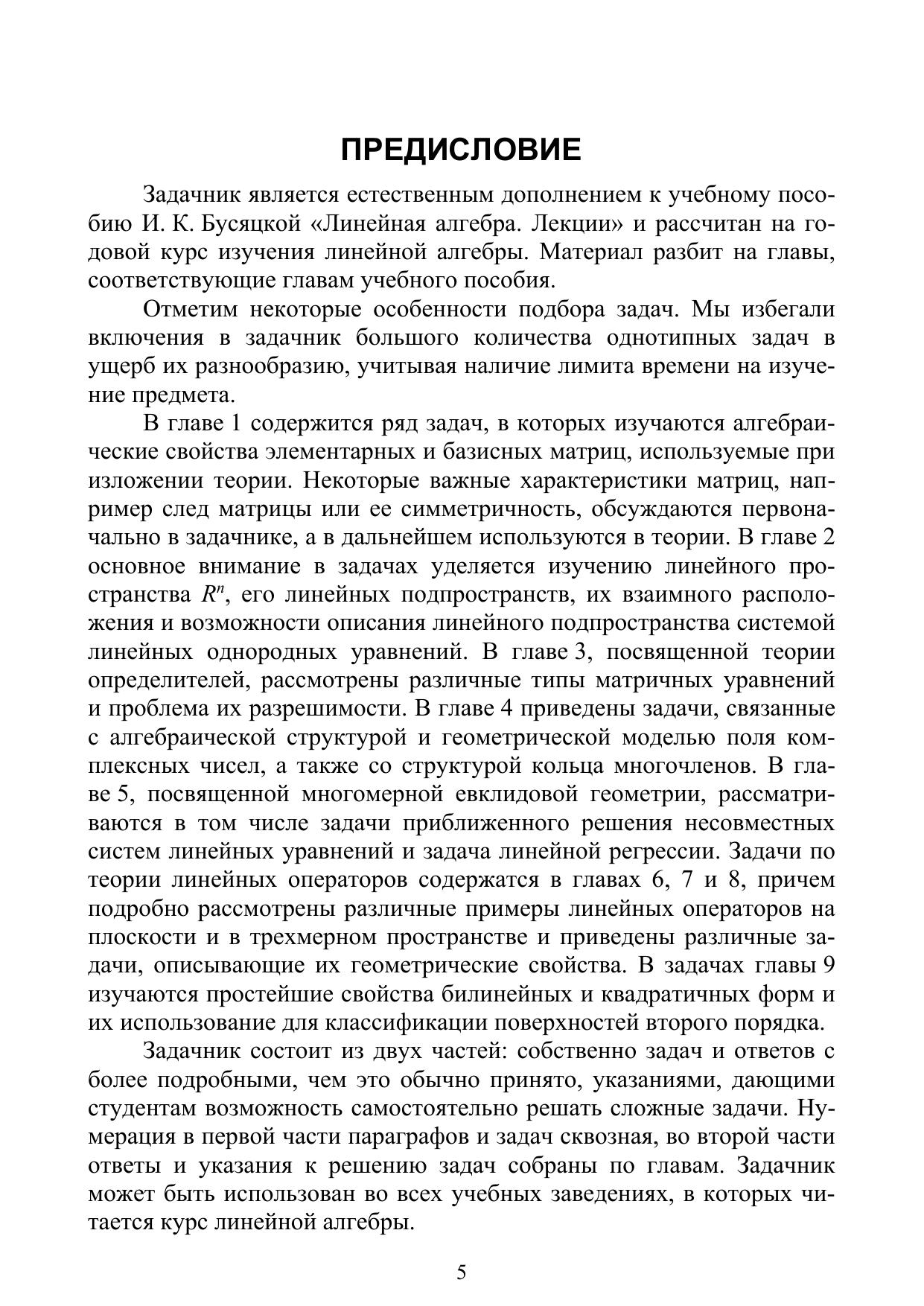 Задачник является естественным дополнением к учебнику И. К. Бусяцкой «Линейная алгебра. Лекции». Он состоит из двух частей: собственно задач и ответов с подробными указаниями. При подборе задач акцент был сделан не столько на типовые и вычислительные примеры, обычно разбираемые на семинарах, сколько на содержательные задачи, решение которых позволяет студенту углубить свое понимание курса лекций по Линейной алгебре и расширить свой математический кругозор. Задачник может быть использован во всех учебных заведениях, в которых читается курс Линейной алгебры.