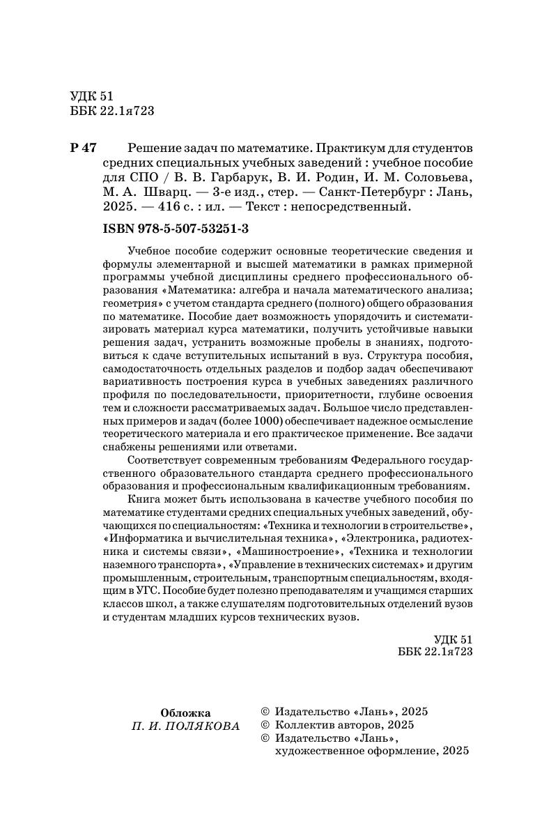 Учебное пособие содержит основные теоретические сведения и формулы элементарной и высшей математики в рамках примерной программы учебной дисциплины среднего профессионального образования «Математика: алгебра и начала математического анализа, геометрия» с учетом стандарта среднего (полного) общего образования по математике. Пособие дает возможность упорядочить и систематизировать материал курса математики, получить устойчивые навыки решения задач, устранить возможные пробелы в знаниях, подготовиться к сдаче вступительных испытаний в вуз. Структура пособия, самодостаточность отдельных разделов и подбор задач обеспечивают вариативность построения курса в учебных заведениях различного профиля по последовательности, приоритетности, глубине освоения тем и сложности рассматриваемых задач. Большое число представленных примеров и задач (более 1000) обеспечивает надежное осмысление теоретического материала и его практическое применение. Все задачи снабжены решениями или ответами. Соответствует современным требованиям Федерального государственного образовательного стандарта среднего профессионального образования и профессиональным квалификационным требованиям. Книга может быть использована в качестве учебного пособия по математике студентами средних специальных учебных заведений, обучающихся по специальностям: «Техника и технологии в строительстве», «Информатика и вычислительная техника», «Электроника, радиотехника и системе связи», «Машиностроение», «Техника и технологии наземного транспорта», «Управление в технических системах» и другим промышленным, строительным, транспортным специальностям, входящим в УГС. Пособие будет полезно преподавателям и учащимся старших классов школ, а также слушателям подготовительных отделений вузов и студентам младших курсов технических вузов.